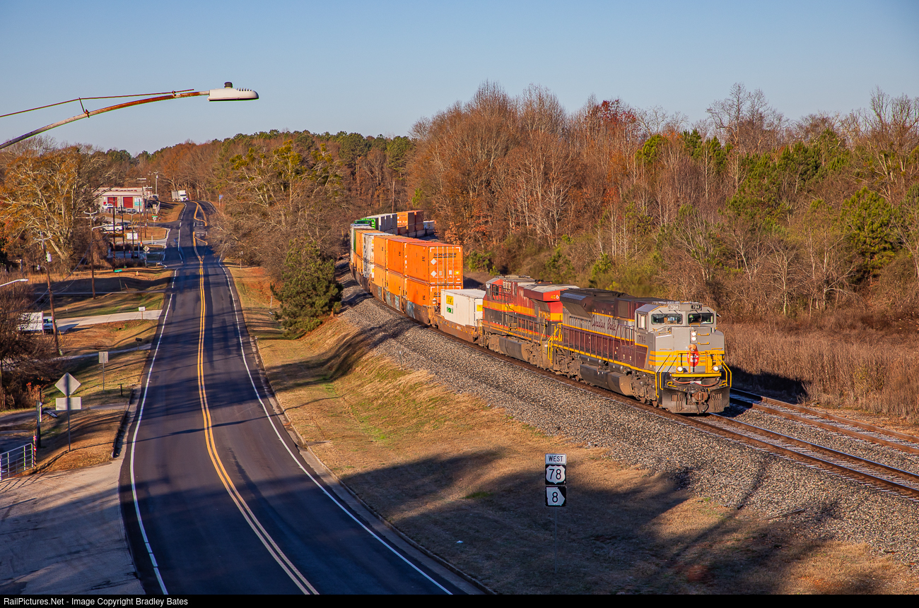 It's just after sunrise on a cold December morning as Norfolk Southern Train 244 rumbles eastbound through Villa Rica, GA. with one of Canadian Pacific's Heritage SD70ACu locomotives leading the way.