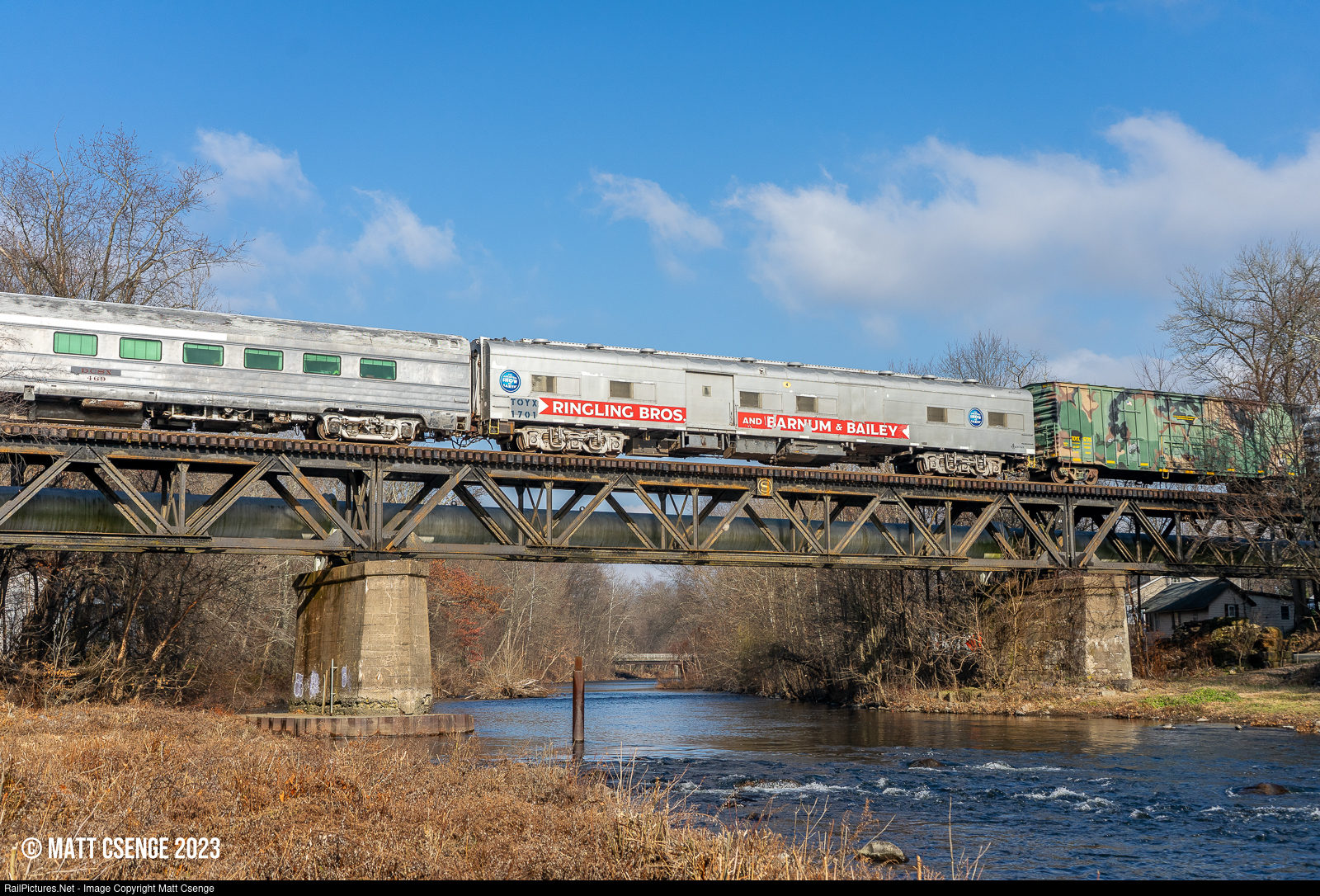 The Operation Toy Train special ran on the New York, Susquehanna & Western's Southern Division Main Line on December 9, 2023, collecting donated toys from communities along the railroad. The train featured a variety of equipment including TOYX baggage car 1701, which has an interesting backstory. The car was originally built by ACF in February 1961 as Union Pacific baggage-messenger 6304. In 1975, it was retired from passenger service and entered work service as car no. 904807. Twenty years later it was sold to Ringling Brothers and Barnum & Bailey's circus, who extensively rebuilt the car: renumbering it as RBBB 60017, replacing the exterior steel skin with aluminum, and reconfiguring it to transport elephants. RBBB later used it to transport horses before retiring it and their entire rail fleet in 2016. It was donated to the Dining Car Society in 2017, who leased it to Operation Toy Train in 2023 when it was renumbered to TOYX 1701.