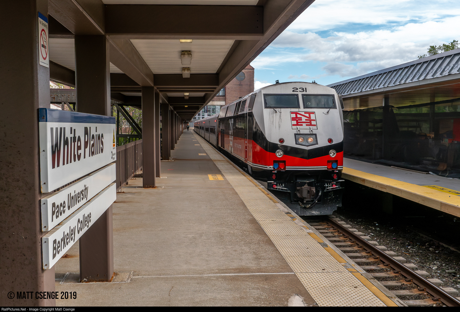 Metro-North Railroad P32AC-DM no. 231 (GE Genesis, 1995-2001) idles at White Plains Station with a northbound Harlem Line train. Due to an incident at Valhalla, the line was single tracked so the train was waiting for the southbound to clear before continuing. |