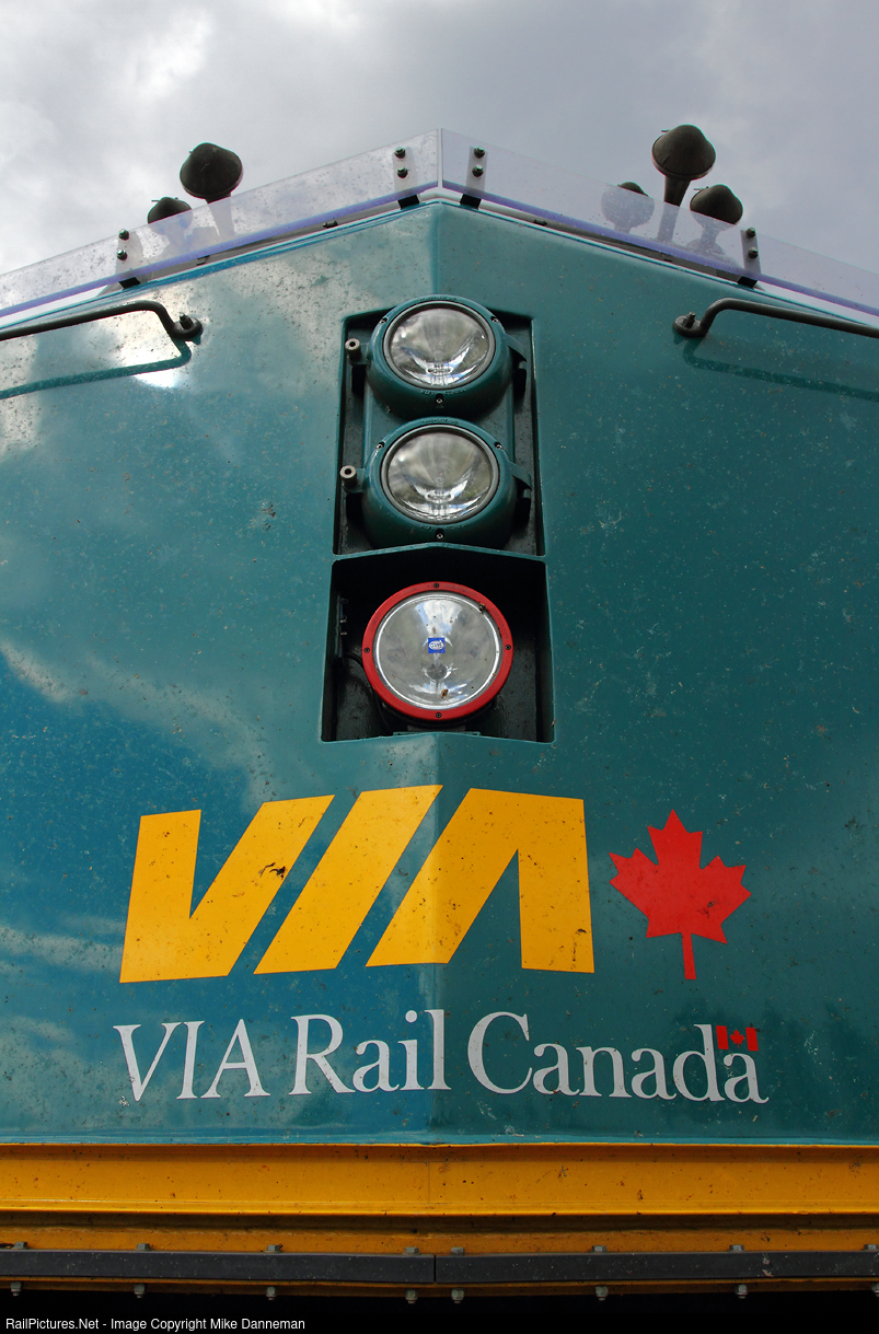 Warning devises abound on the prow of VIA Rail’s EMD F40PH-3 No. 6451 at Jasper, Alberta, on July 13, 2013. Two sets of horns, headlights and a warning light help keep VIA Rail passenger trains audible and visible to the trackside public.