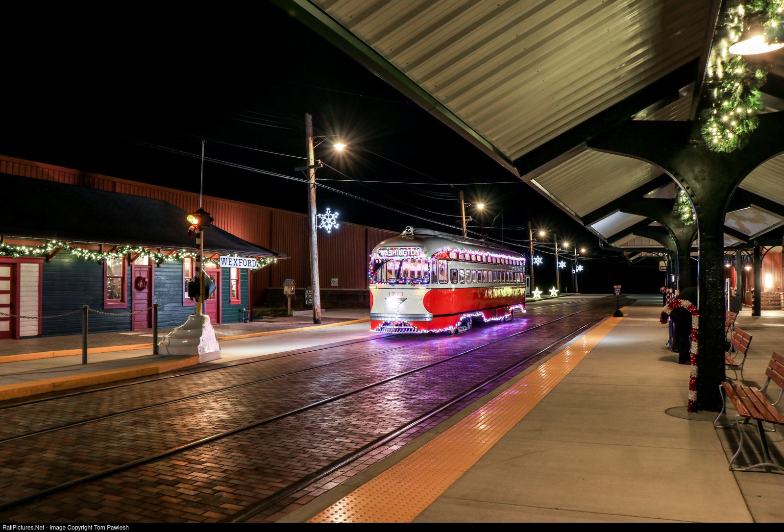 Pittsburgh Railways Company 1711 decorated for Christmas and running as the Yuletide Shuttle during the annual Santa Trolley. The Pennsylvania Trolley Museum opened their new Welcome and Education Center in November and all operations are now out of the beautiful new building. PRC 1711 is seen on Volunteer Boulevard with Wexford Station and the Trolley Display Building on the left. The platform at the new Welcome & Education Building are on the right.