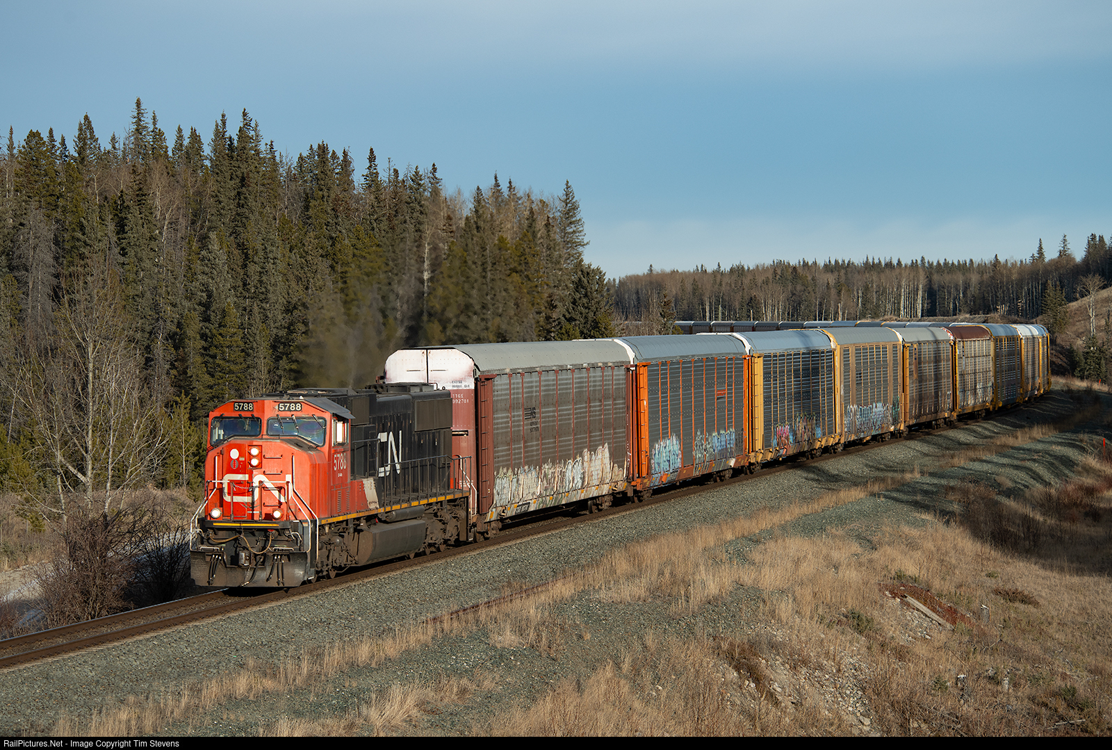 CN SD75I 5788 leads 88 empty autoracks through Pedley on CN's Edson Sub.