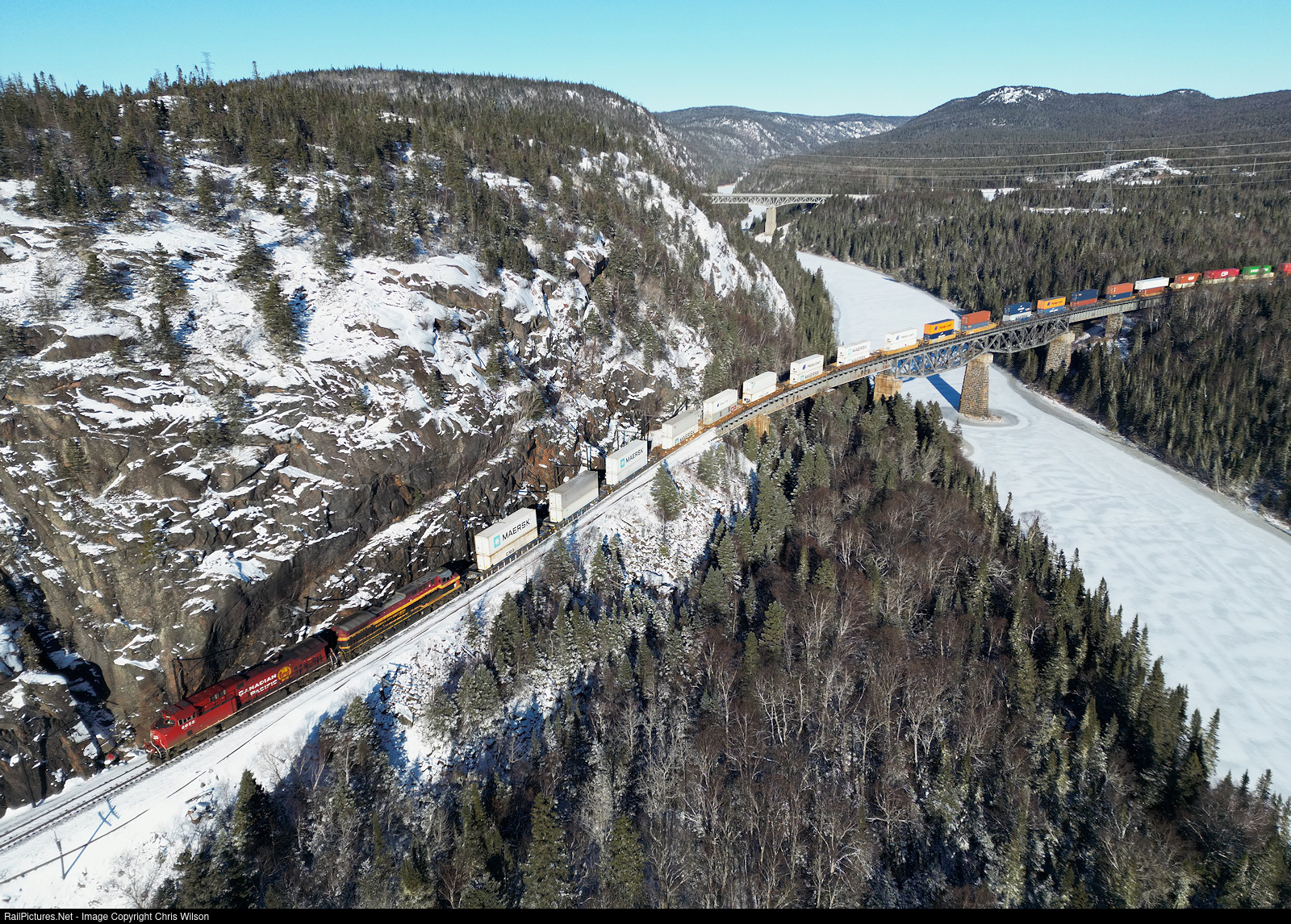 Montreal to Vancouver stacks cross the frozen Little Pic River at Neys