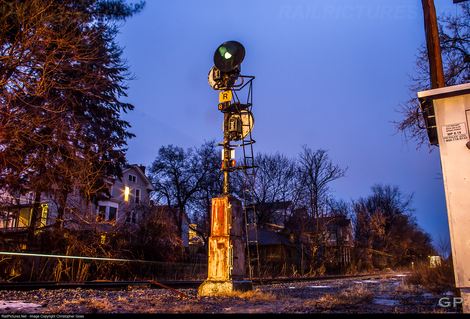 The former automatic D&H Searchlight style signal at milepost 8.1 in the City of Cohoes which protected the siding for Mohawk Paper brightens in the early evening as the 450 swifts by northbound back in 2014.