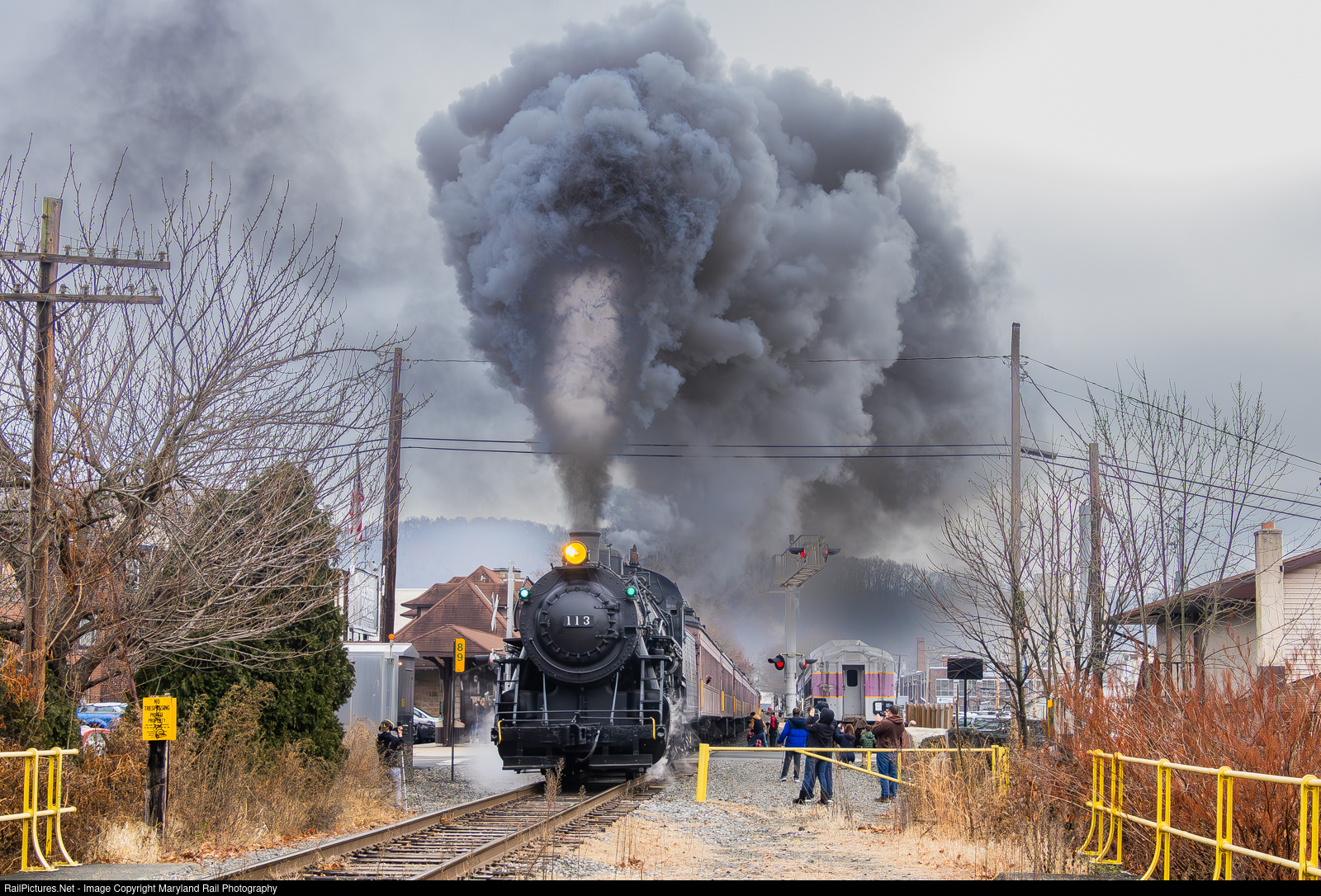 | Santa Claus Special with the CNJ 113 putting on a show for the railfans with a huge plume of smoke charging through West Main Street passing by the Schuylkill Haven Station in Schuylkill Haven, PA |
