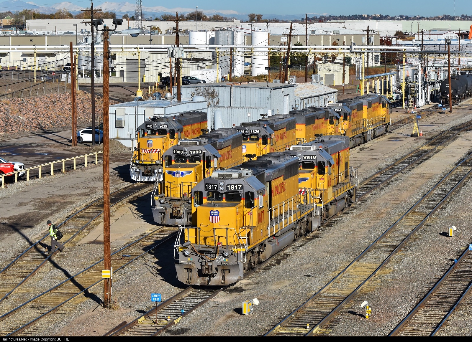 | UP 1817 (SD40N) and other light power sit in an echelon right formation in the Union Pacific's North Yard in Denver, Colorado.