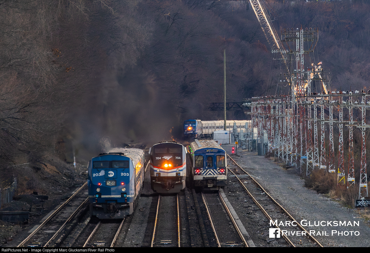 Traffic Jam At CP12. In the area of the five-track junction near Spuyten Duyvil in the Bronx, New York, occasionally the timing will cause a slight delay as the railroad goes from 2 to 4 passenger tracks in addition to the lead to Amtrak's Empire Corridor and a switch to an unpowered track in just over a mile. On the morning of Thursday, December 14, 2023, Amtrak Train 63 (Maple Leaf) is led by AMTK 704 (P32AC-DM, Phase III) is in the middle of the scene, in between MTA Metro-North Railroad Train 724 (MNCW 4121, M7A leading) and Train 830 (MNCW 203, P32AC-DM) with Train 807 (MNCW 206, P32AC-DM) in the background. Track 6, the track to the right of the frame without third rail, is used for various work related purposes.