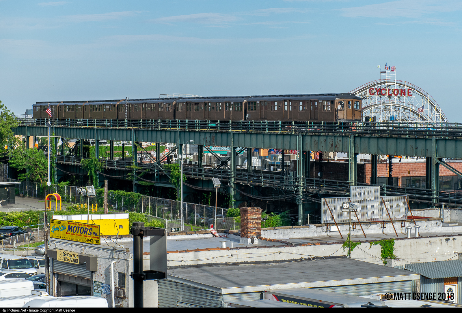South Brooklyn Icons. While relaying to Coney Island Yard on the BMT Brighton Line, a NY Transit Museum train of AB Standards (ACF, 1914-1919) and a D-type Triplex (ACF, 1925-1928) is seen passing another Brooklyn icon: the Cyclone roller coaster. Leading the train is New York City Transit Authority (NYCTA) AB Standard no. 2392. The Triplex - no. 6095 - is a three-unit articulated set: three carbodies permanently connected on four trucks.