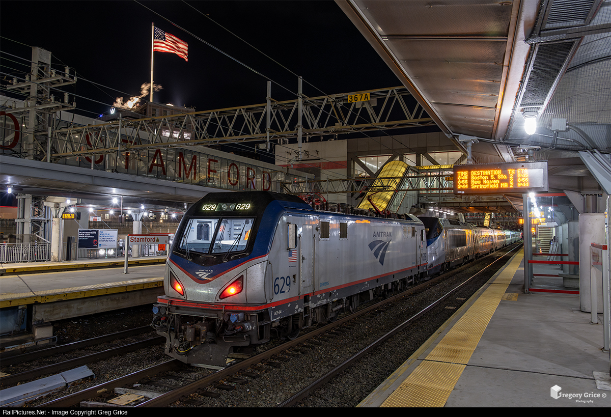On the late evening of December 6th, 2023 Amtrak ACS-64 629, with disabled Acela train 2155 in tow, pauses for an unusual recrew at Stamford station on Metro-North Railroad's New Haven Line. 2155 suffered mechanical issues west of Kingston, Rhode Island on the Northeast Corridor, preventing it from continuing its trip to Washington DC. An equipment repositioning move originally recovered the disabled trainset and brought it to New Haven, where 629 was added for the rest of the journey to New York.