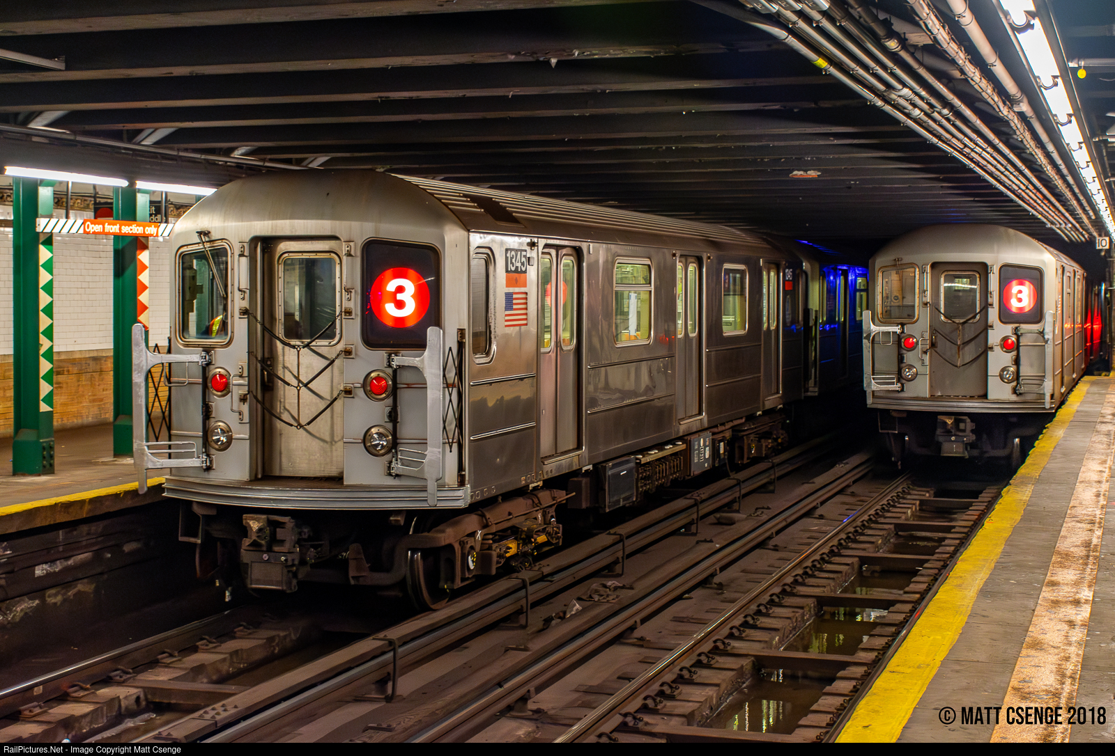 Two Halves. New York City Transit Authority (NYCTA) R62 no. 1345 (Kawasaki, 1983-1985) is seen on the end of an out-of-service (3) train at 145th St Station on the IRT Lenox Avenue Line. The train is waiting for a revenue move to enter Harlem-148th St before moving into Lenox Yard. At left is some signage that is unique in the subway system, reminding conductors to only open the doors on the front half of the train - 145th St is the only half-length station left in the system. It was planned for the Lenox Line to connect with the Jerome Ave (Woodlawn) Line via 145th St, but this never came to fruition. Early subway stations were built to be 6 cars long, though it was very quickly realized that 10 car trains would be needed to meet the ridership demand. This station was never extended as it sits between two interlockings, and any extension to 10-car length would encroach on their limits. The station was to be closed upon the opening of 148th St-Lenox Terminal, but community opposition led to it staying open in its original state.