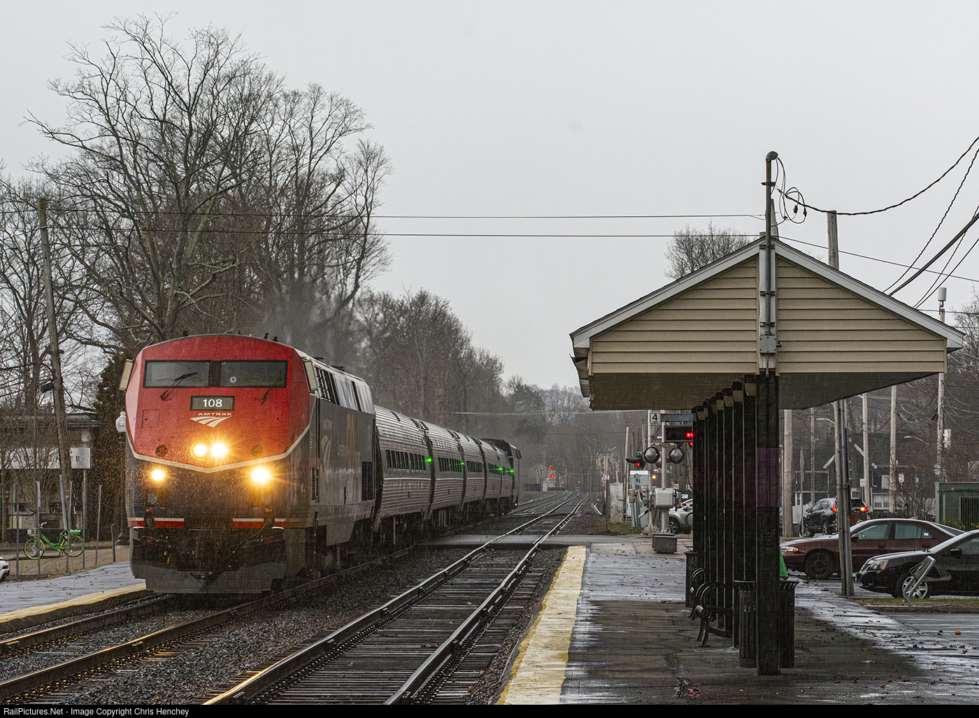 | In the many times I've taken photos at this station, this has to easily be the best catch I've gotten. Amtrak's Red and Blue 50th Anniversary engine is the leader on a Downeaster train headed for Brunswick, as it trundles up its non-traditional routing via the Western Route to Wilmington Junction in a light rain on a Spring afternnon. |
