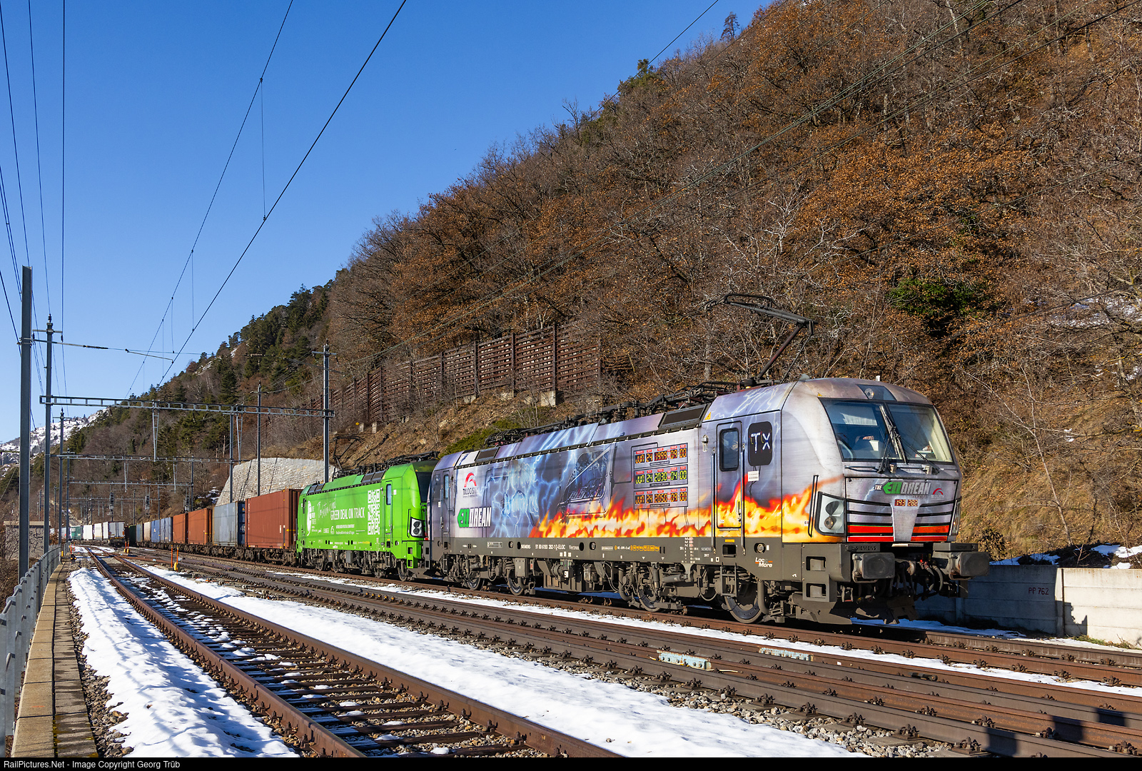 Siemens Vectron 193 # 282 and # 281 of the European Locomotive Leasing (ELL), rented to the TXLogistik, in multiple control, pull the southbound intermodal train 41009 from Rheinhausen Hafen/Germany via Basel-Lötschberg mountain line-Simplon-Domodossola to Pomezia Santa Palomba/Italy, through Hohtenn on the south ramp of the Lötschberg mountain line. The train ran over the mountain line, because the Lötschberg Base Tunnel was all single track this day due to water break-in. The first locomotive has the "ELLOREAN" paint scheme: The exterior design of the ELL Vectron 193 # 282 is probably to be understood as a homage to the film "Back to the Future". The "ELLOREAN" is used for TXLogistik and shows elements of the De Lorean DMC-12 - a hapless pseudo sports car from the 1980s, which played a leading role in the film and was converted into a time machine.