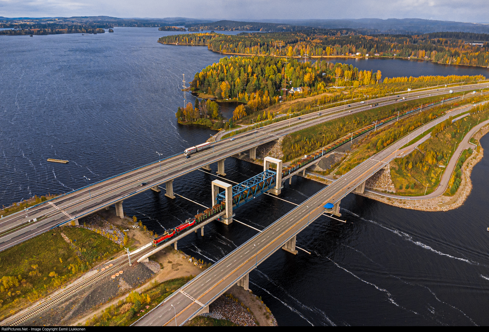 | Two class Dv12s are hauling a timber train to Pieksämäki as their crossing the Kallansillat railbridges on the windy lake Kallavesi. |