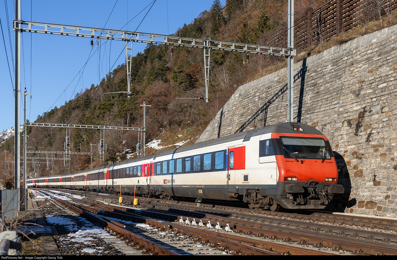 | Empty SBB rolling stock move 32437 from Spiez over the Lötschberg mountain line to Brig, running through Hohtenn. Leading is cab car Bt and in the rear not visible Re 460 # 075. This day there was single track operation only in the base tunnel due to water break-in, so this train was diverted via the mountain line. |