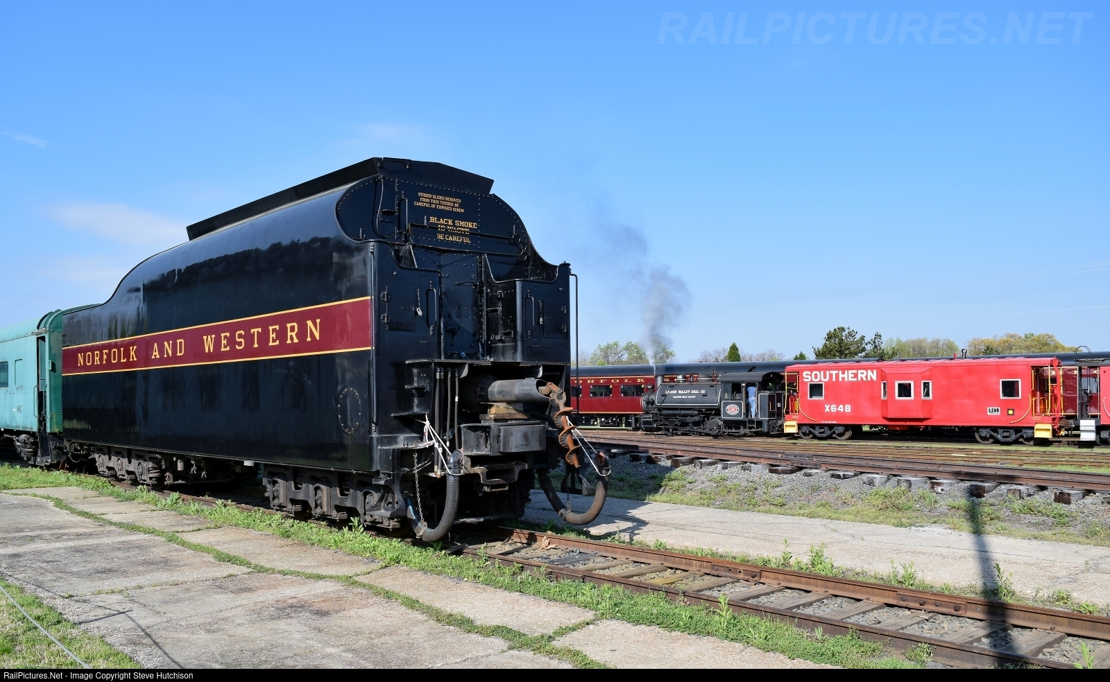 A view not often seen. The tender of N&W 611 sits alone outside the roundhouse while 611 is being worked on inside one of the roundhouse bays. In the background, Lehigh Valley Coal Co 0-6-0 saddle tank engine #126, has the North Carolina Transportation Museum caboose train in tow.