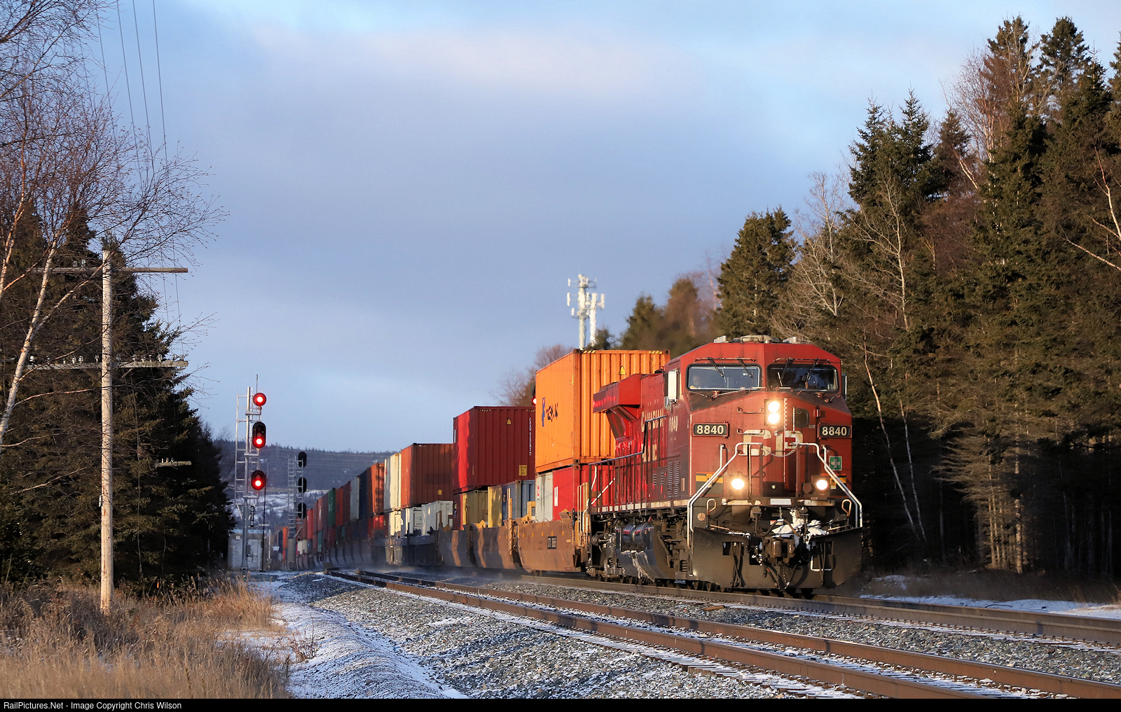 | CP ES44AC 8840 hauls 9334' of port stacks (Vancouver Deltaport, BC - Toronto Yard, ON [Vaughan Intermodal] east along the Heron Bay Sub |