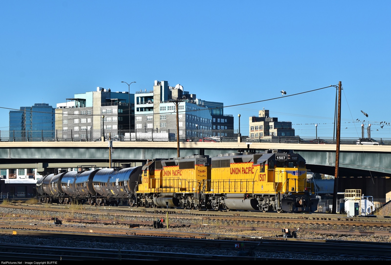 UP 1507 (GP40M) brings a freight into the BNSF yard in downtown Denver, Colorado.