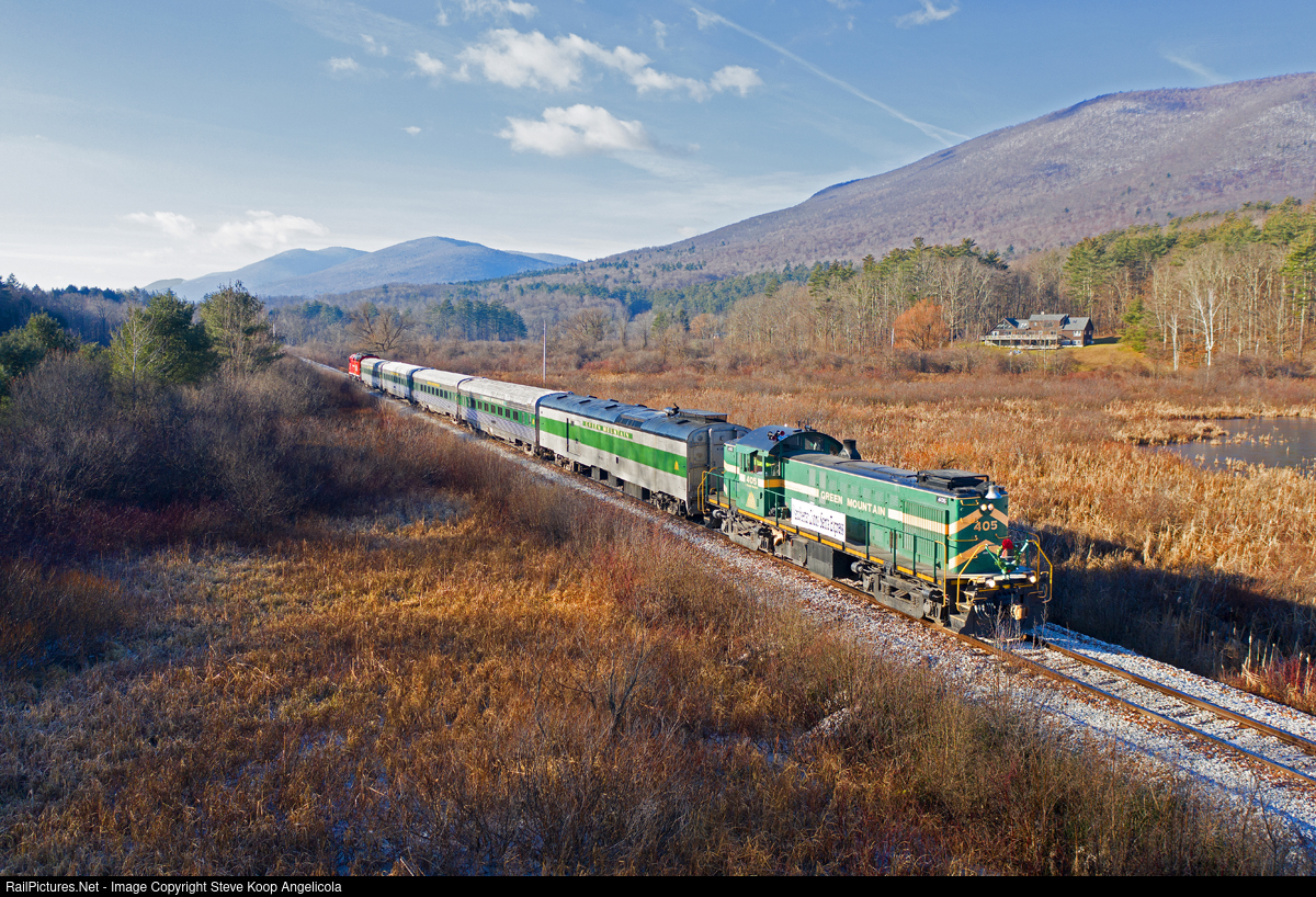 | Vermont Railway's Elf Express Christmas Train operated from Manchester to Arlington, VT with RS-1 GMRC 405 and GP40FH-2 VTR 313 providing an exceptional pair of locomotives for this years train. The 313 made its first mainline debut hauling passengers and the classic ex-Rutland Alco 405 made an extremely rare appearance on home rails over the B&R line. |