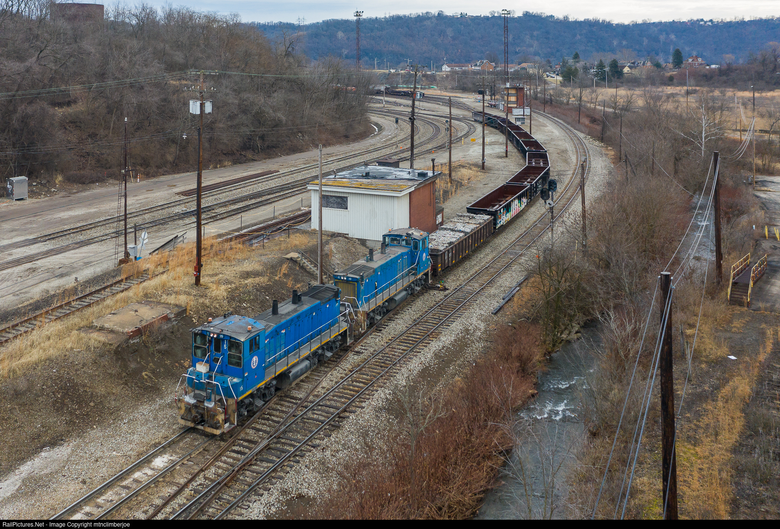 | A pair of Union Railroad MP15DC's switch out cars at the railroad's Mon-Southern Classification Yard in Duquesne, Pennsylvania, sorting out empty coil gons and loaded scrap cars. The power is rolling past the old hump as it works the south end lead alongside the Thompson Run creek. |