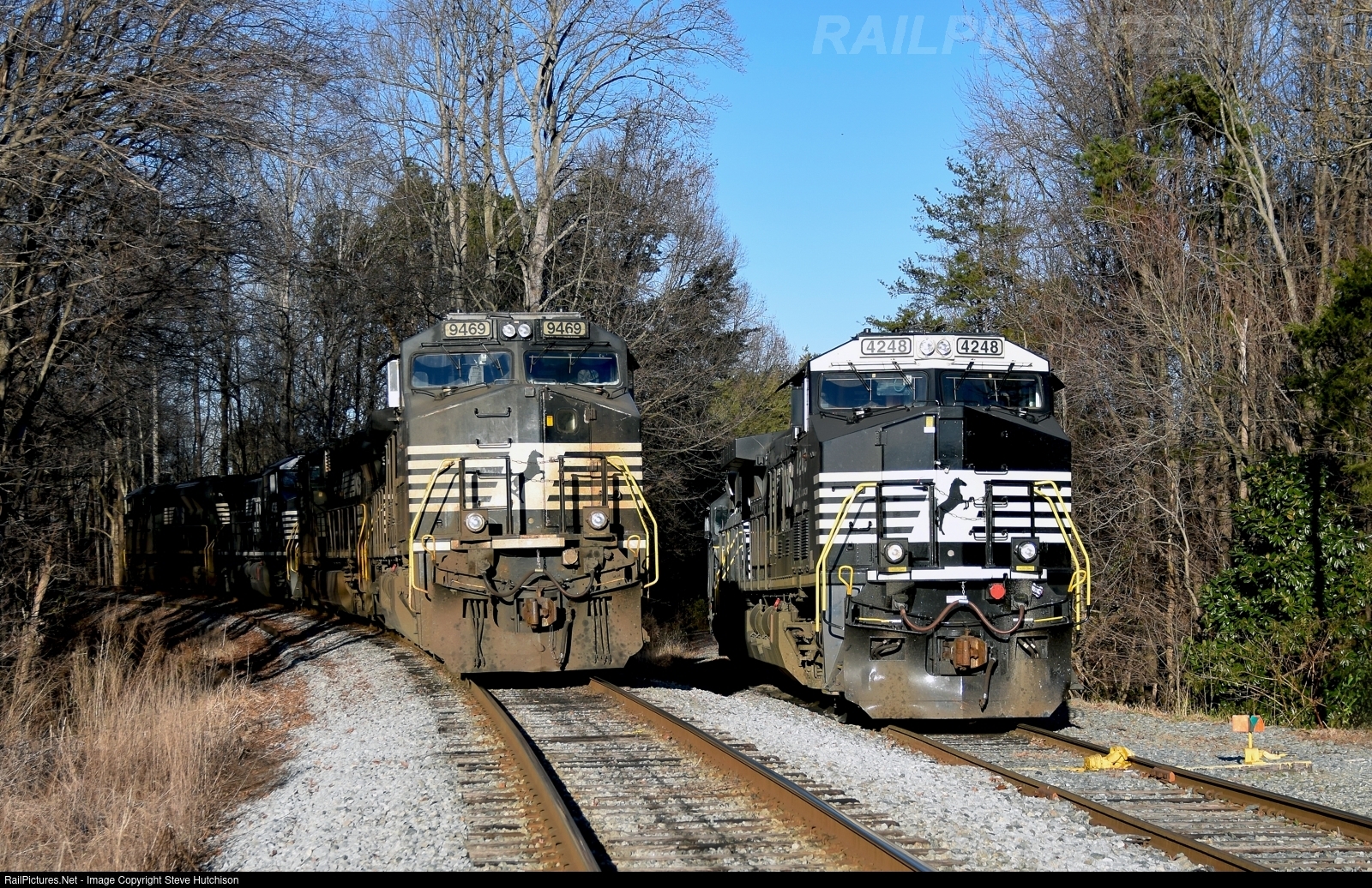 | All is quiet the day after Christmas on the Winston Salem Southbound. 9469 leads a four unit light engine set that is shutdown on the mainline. NS 4248, AC44C6M, and one other unit are parked on the short siding beside the WSSB-HPT&D Yard Office. |