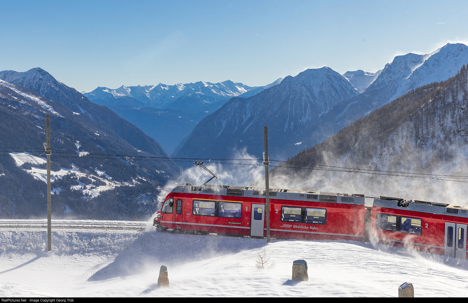 | With a strong wind blowing from the north, the "Allegra" ABe 8/12 # 3511, running around the panorama curve, is kicking up snow in front of train R 1644 from Tirano to St. Moritz. The view goes into the Poschiavo valley and the bergamasque alps in Italy south of the Veltlin. |