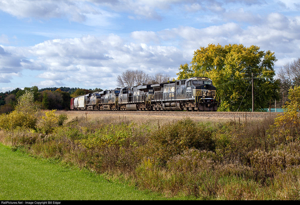 A Union Pacific manifest from Altoona to Adams, WI rounds the curve into Fall Creek, WI after leaving Altoona. Today's freight featured a nice quartet of NS GE power, led by rebuilt C40-9, NS 4060, now classified as an AC44C6M. The unit was built in February 1995 as NS 8828.