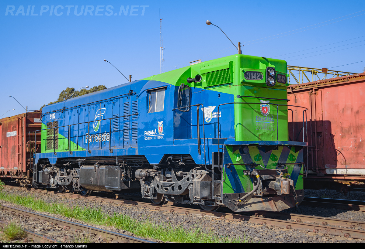 | Ferroeste EMD G12 No. 9142 awaiting service at the Guarapuava yard on the afternoon of August 5, 2023. Researchers believe it is the ex MRN (Mineração Rio do Norte) 103 that ran on the FTC (Ferrovia Tereza Cristina) before going to Paraná. Ferroeste is a Brazilian state-owned railway company created on March 15, 1988, whose main shareholder is the state of Paraná. |