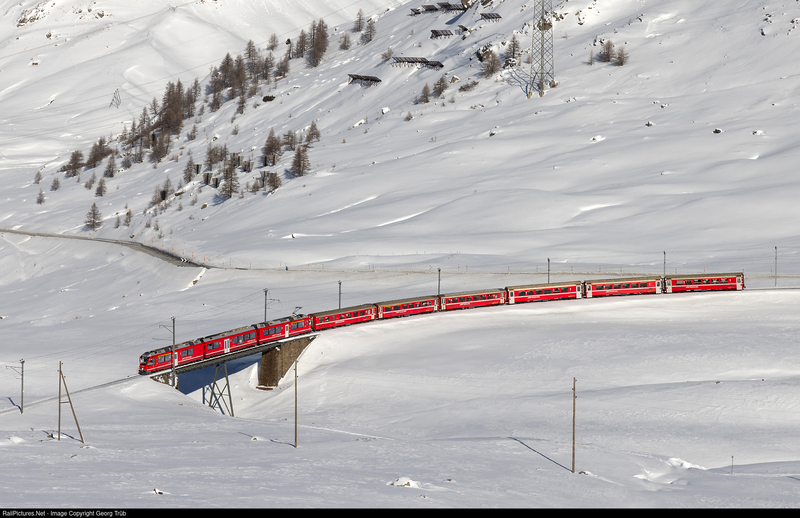 | An unknwon "Allegra" ABe 8/12 of the Rhaetian Railway pulls the about 50 minutes late regional train 4640 Tirano-St.Moritz over the upper Ova da Bernina bridge, between Ospizio Bernina and Bernina Lagalb. There was a train break-down between Tirano and Brusio this day, with longer delays on the Bernina line. |