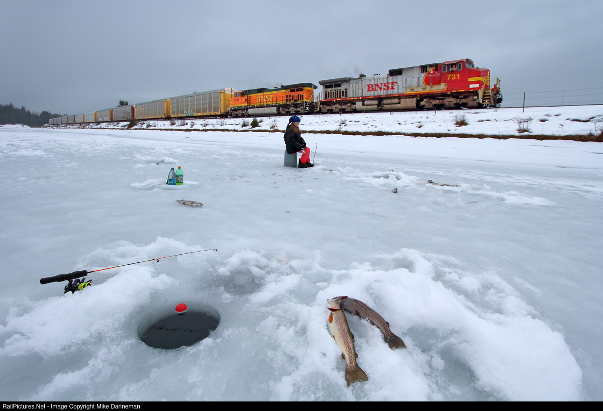 A young daughter of one of the residents of Trout Creek, Montana, tries her luck at ice fishing on Frog Pond along the Clark Fork on January 25, 2013. Rumbling along between the two over a frozen causeway on Montana Rail Link’s Fourth Subdivision main line is an eastbound BNSF vehicle train led by Warbonnet BNSF GE C44-9W No. 731. The engineer looks out an open window to see how they are doing. Pretty good, I’d say, as she caught her her first fish ever through the ice that day and now patiently waits for another trout to nibble.