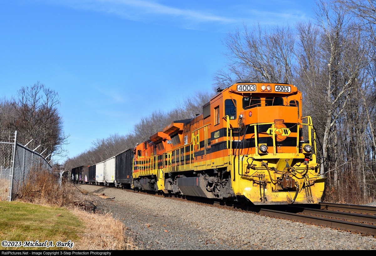 | On the Friday before Christmas in Windsor, a pair of candy corn GEs are in charge of Connecticut Southern CSO-4 with 56 cars for Hartford Yard. Powering the freight is Providence & Worcester B40-8 4003, originally from New York, Susquehanna and Western and Connecticut Southern B39-8 3901. |