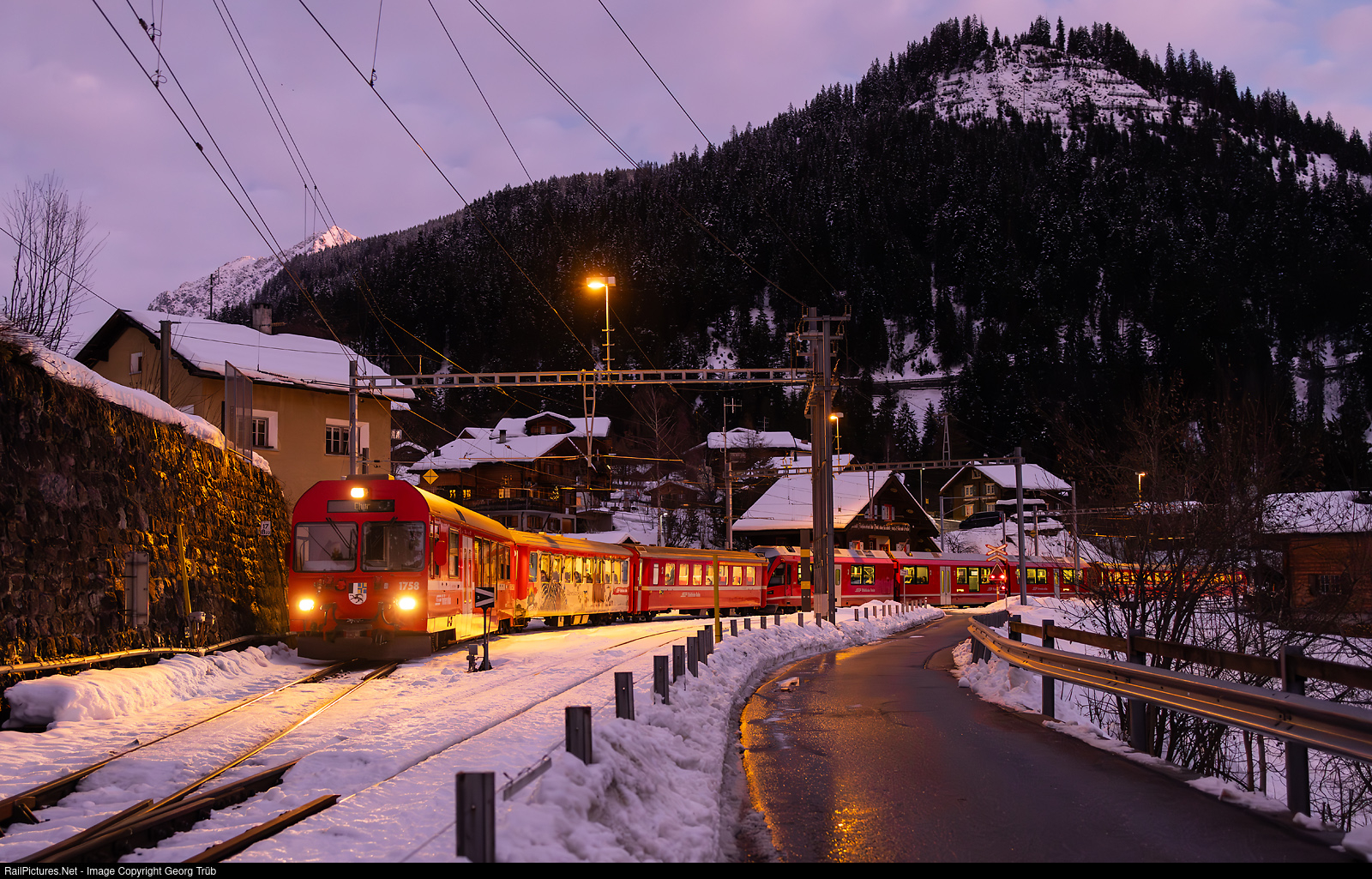 | When night is falling, the regional train R 1456 of the line R16 of the Rhaetian Railway from Arosa to Chur is leaving Langwies. In front of the push-pull train is cab car BDt # 1758, followed by second class standard car type B I in the "Bärenland" design, a mixed first/second class AB type II, "Allegra" ABe 8/12 # 3509 and in the rear two second class B II as reinforcement. |