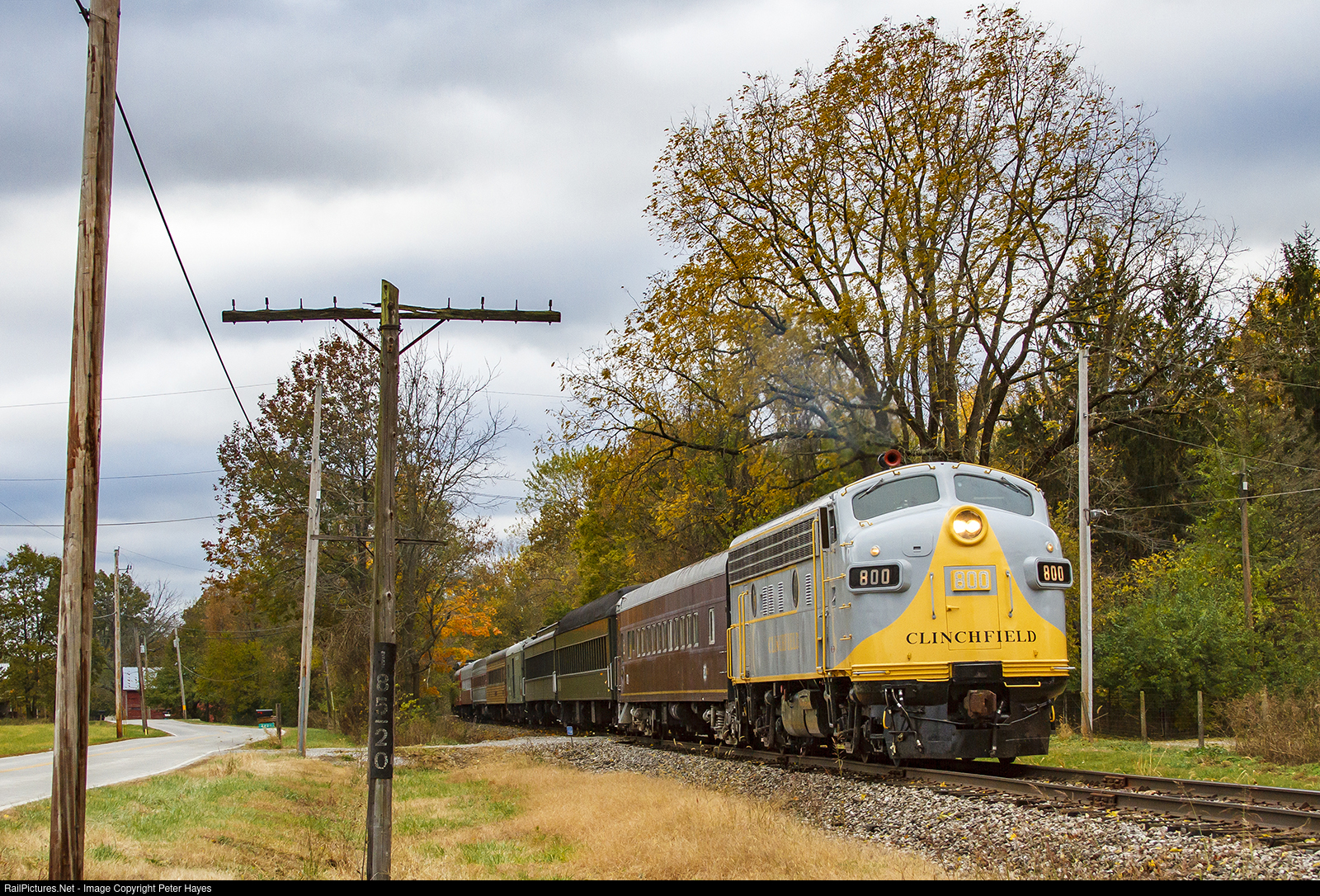 | Classic streamlined Clinchfield 800 leads an Ohio Rail Experience excursion north, passing DT&I codeline still showing a mile measurement so crews could eyeball their speed in days long past. |