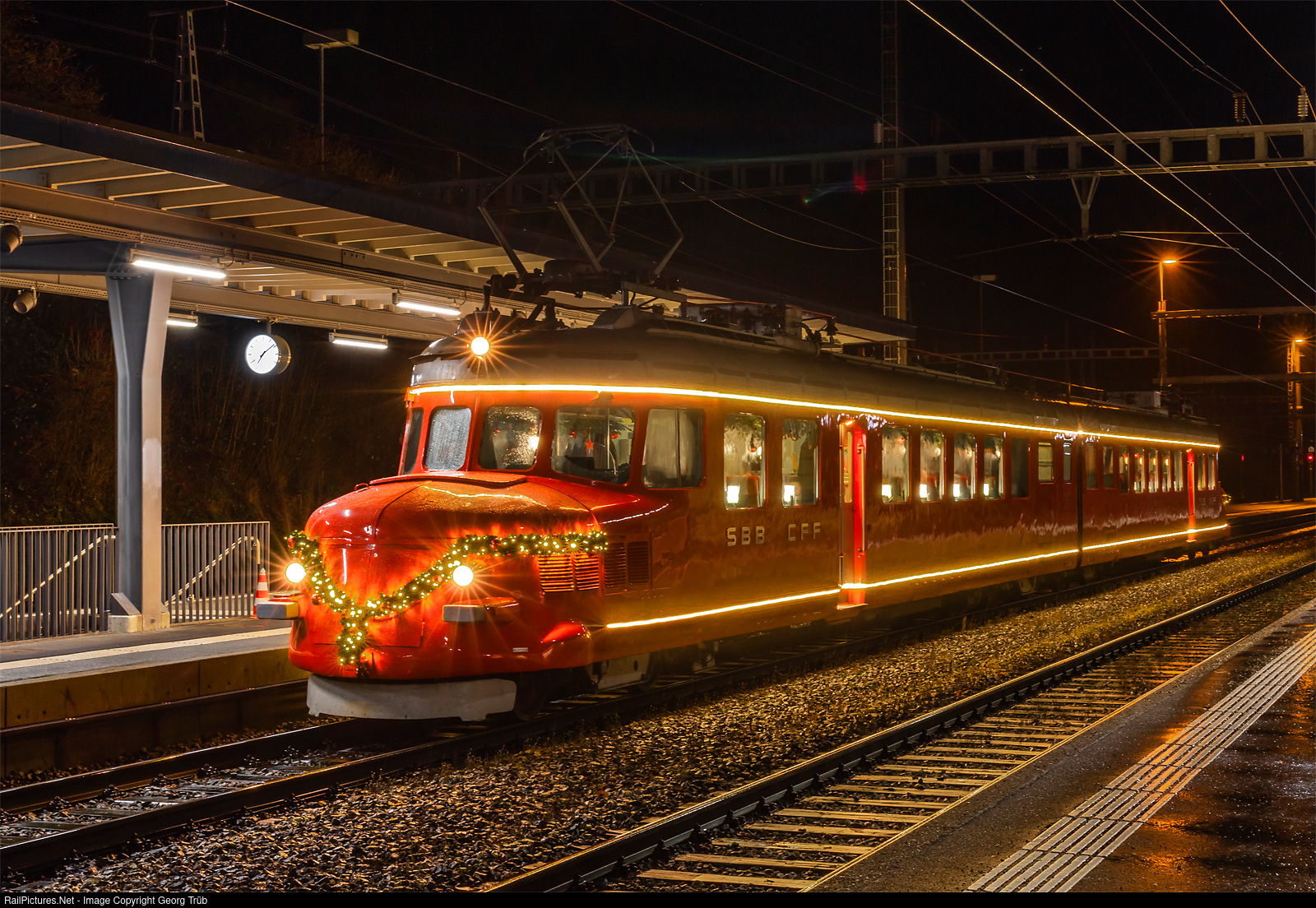 The SBB's red "Churchill Arrow" RAe 4/8 # 1021, decorated for Christmas, is on its traditional Christmas Eve excursion. The journey first led from Zurich via Bülach to Schaffhausen with a pass by the illuminated Rhine Falls. Then back to Eglisau, on via Koblenz-Turgi-Brugg to Othmarsingen, and via Mägenwil-Wettingen back to Zurich main station. The iconic double red arrow "Churchill-Pfeil", built in 1939, just reached Eglisau coming from Schaffhausen.