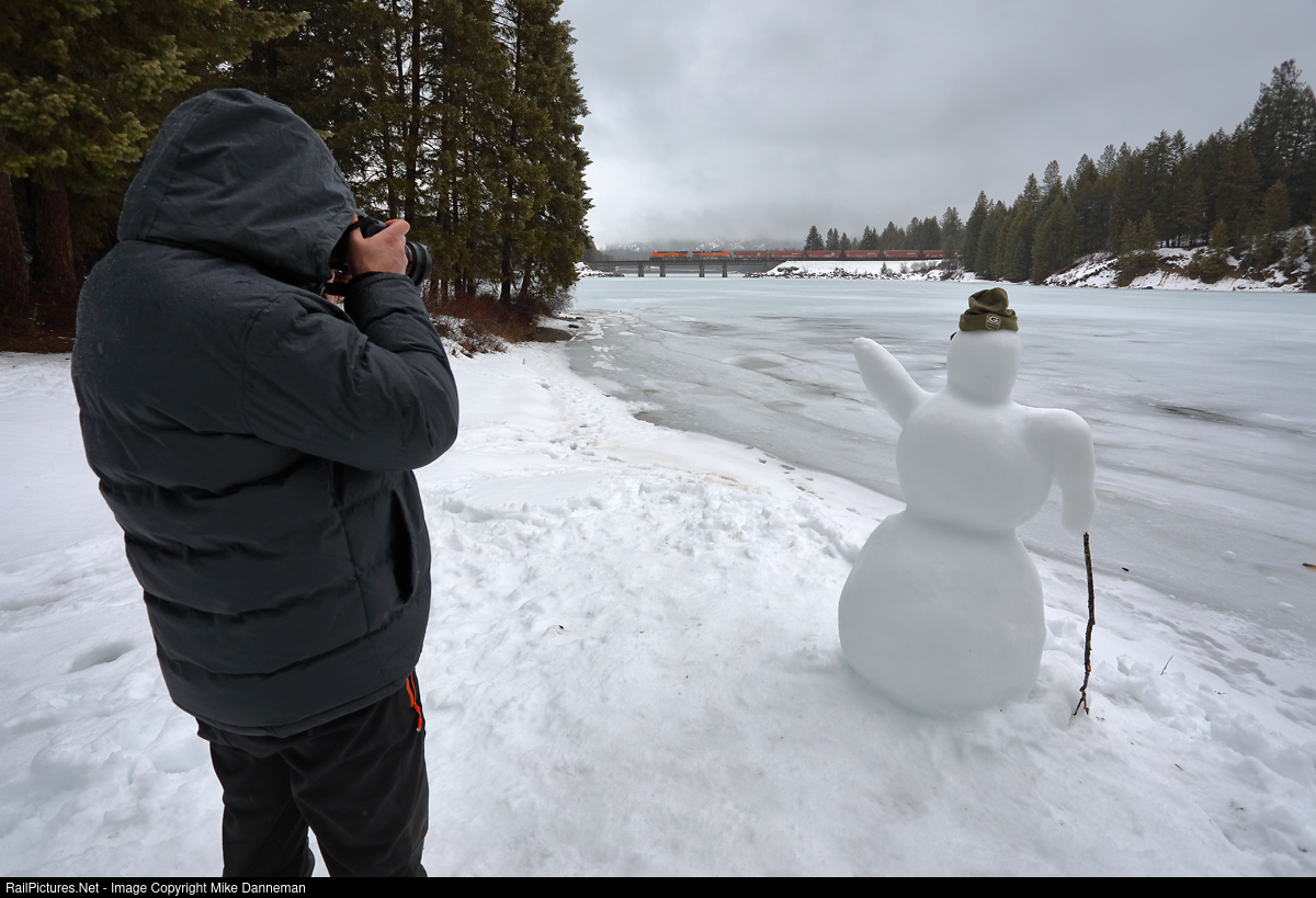 My brother Tom photographs a snowman that is seemingly waving to a westbound BNSF grain train grossing Bridge 55 at Trout Creek, Montana, on a rainy January 26, 2020. On the cusp of snow was the wintery precipitation.