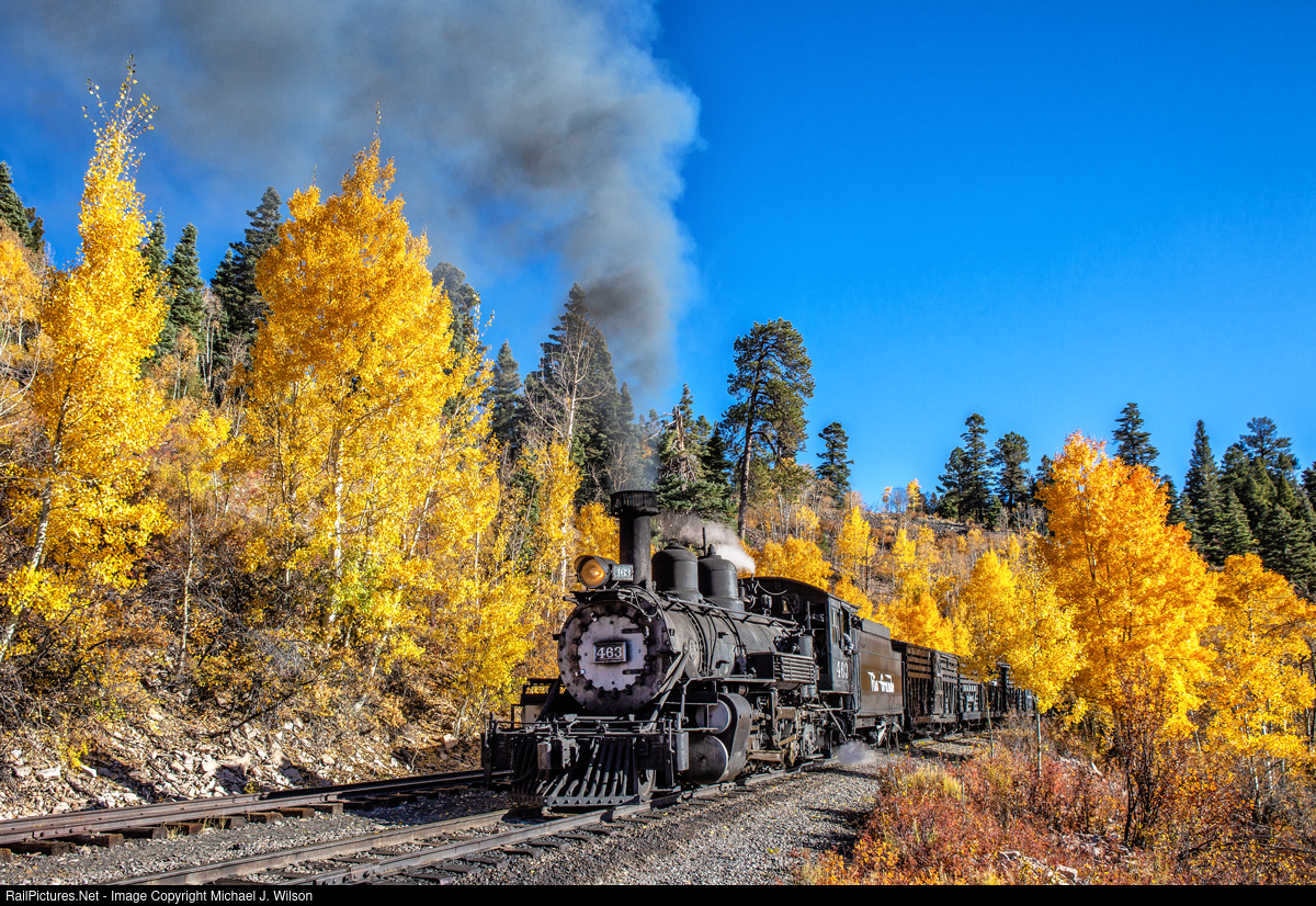| Amid brilliant Aspen trees, D&RGW #463 shuffles by Sublette along the Cumbres & Toltec Scenic Railroad on October 19, 2023. |