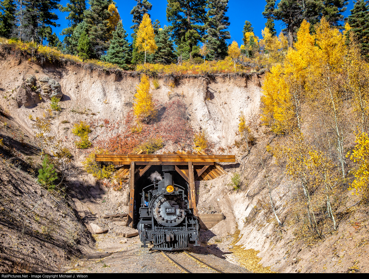 | D&RGW #463 exits Mud Tunnel on October 19, 2023 as she heads east to Antonito, CO on the Cumbres and Toltec Scenic Railroad. |