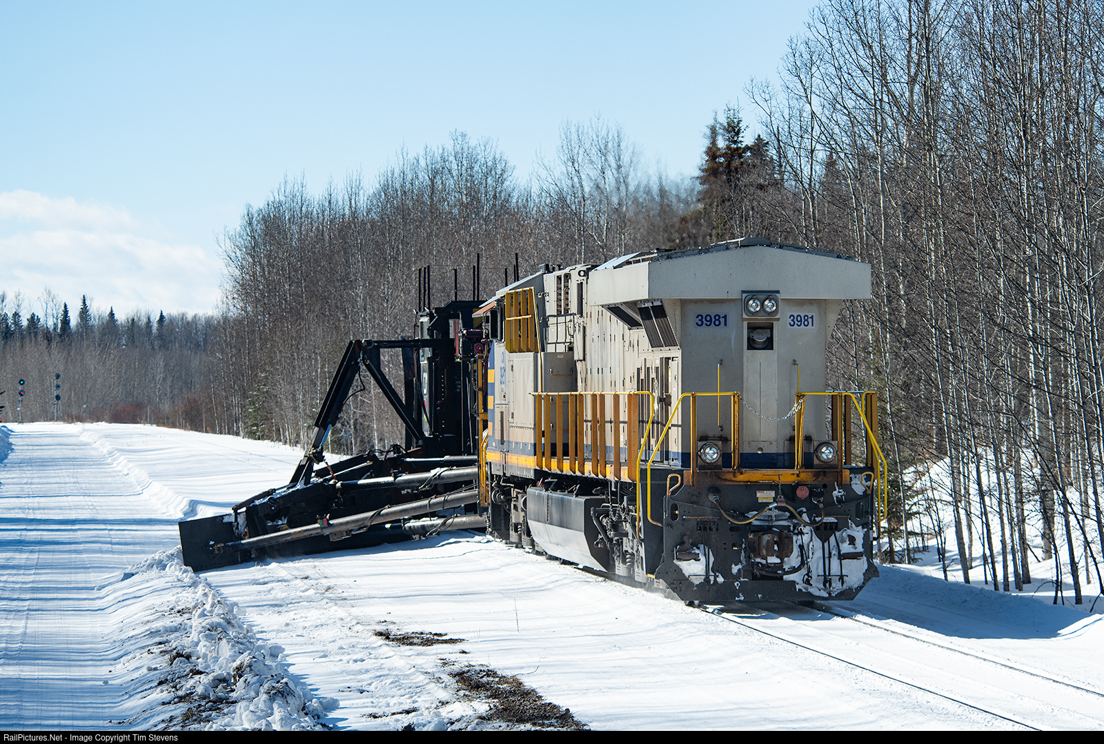 CN ES44AC 3981 pushes CN's Jordan Spreader 50939 westbound onto the Alberta Coal Branch.
