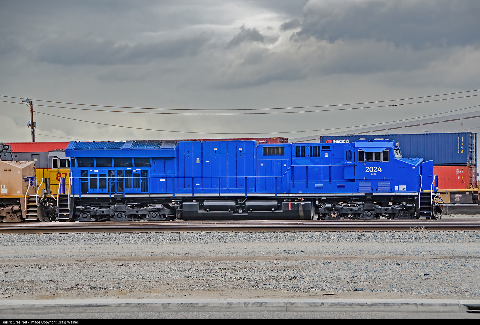 In the latter half of 2013 General Electric built a group of EF44AC 4500hp Tier 4 emissions test locomotives, painted blue and sent out to test on several railroads, including (as seen here) Union Pacific, BNSF Railway and Florida East Coast (and, I'm sure, others, but I only saw them on those three roads … and it's all about me, isn't it?). The first I saw was GECX EF44AC 2024 at Union Pacific's Dolores Yard on Halloween. (Or was it an ES44AC, ES44A6 or ES44C6?) Don't you hate it when the crews leave the doors open? They just let all the flies in...* (Carson, California – October 31, 2014) [* - Me, channeling my late Mom]