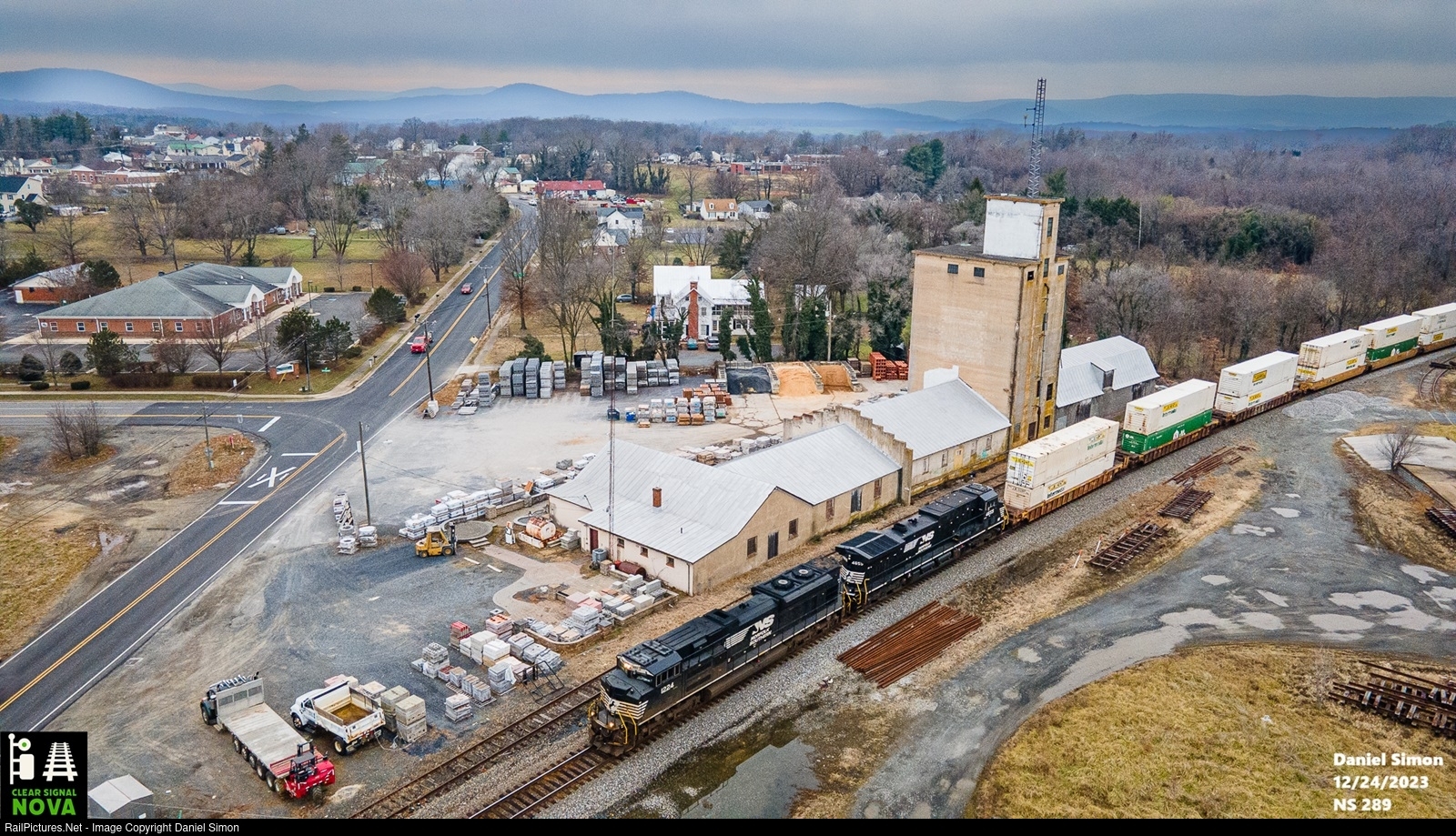 2 days before Christmas, also known as “Christmas Eve Eve”, the recognizable blast of an SD70ACE’s horn can be heard throughout the countryside of Virginia’s Piedmont. Norfolk Southern Train 289 works its way through Marshall past the old Purina Foods tower. The train will be briefly holding up traffic along Virginia State Route 55 which follows the old Southern Railway Branch line as it meanders through the countryside.