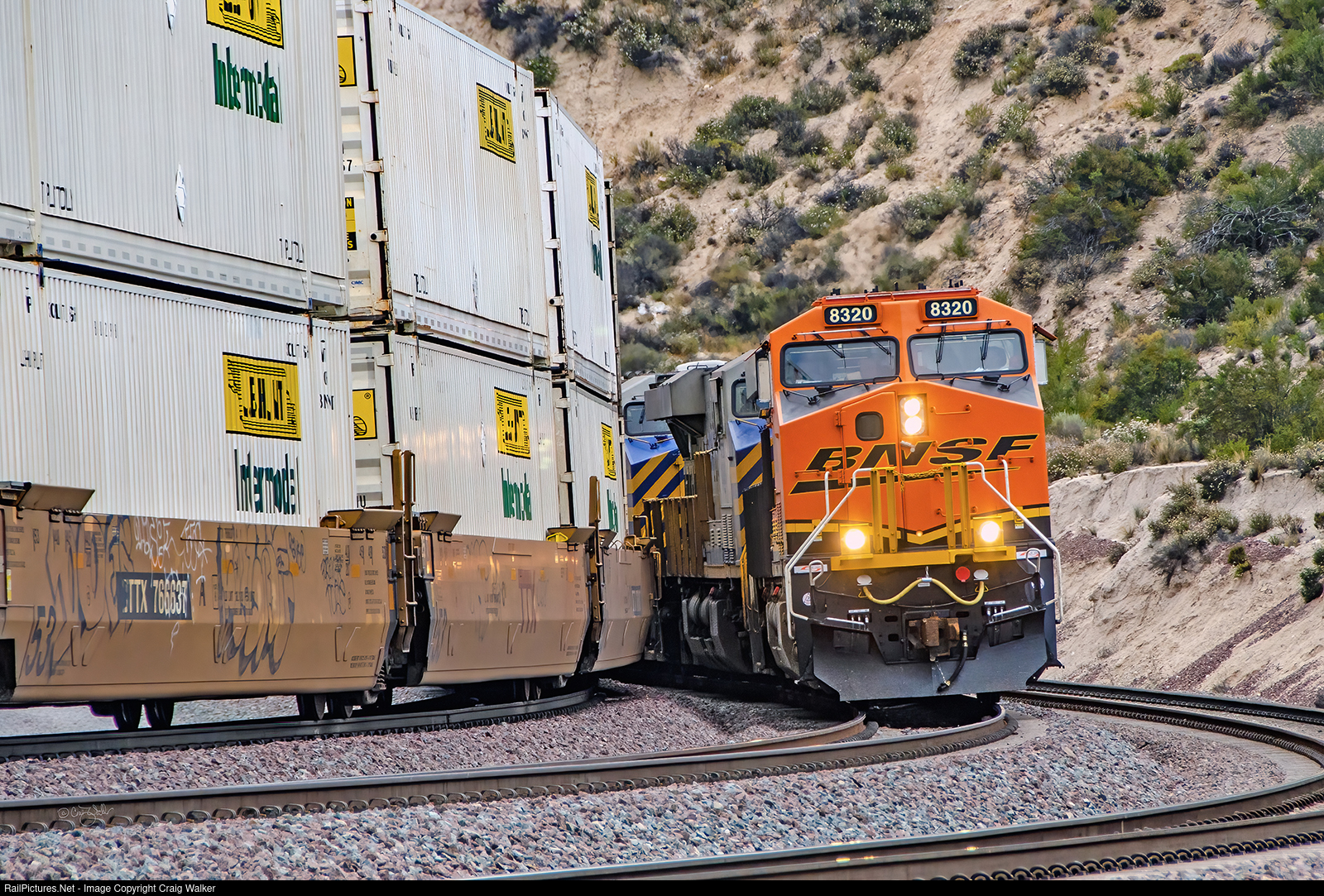 A pair of BNSF Railway Priority UPS-LTL Intermodal "Z Trains" meet at Cajon Pass' Summit. Heading east, and on the left, is train Z-SBDWSP7-26A, heading from San Bernardino CA to Chicago's Willow Springs, with ES44DC 7849 on the point. Rounding the triple-track curve heading west is train Z-WSPLAC9-24A, making its way to Los Angeles from Willow Springs IL. This train was powered by BNSF ES44C4 8320, CREX ES44ACs 1309 and 1332, BNSF ES44C4 7103 and, perhaps most interestingly, GECX EF44AC 2026, a General Electric demonstrator. (Cajon Pass, California – June 26, 2015)