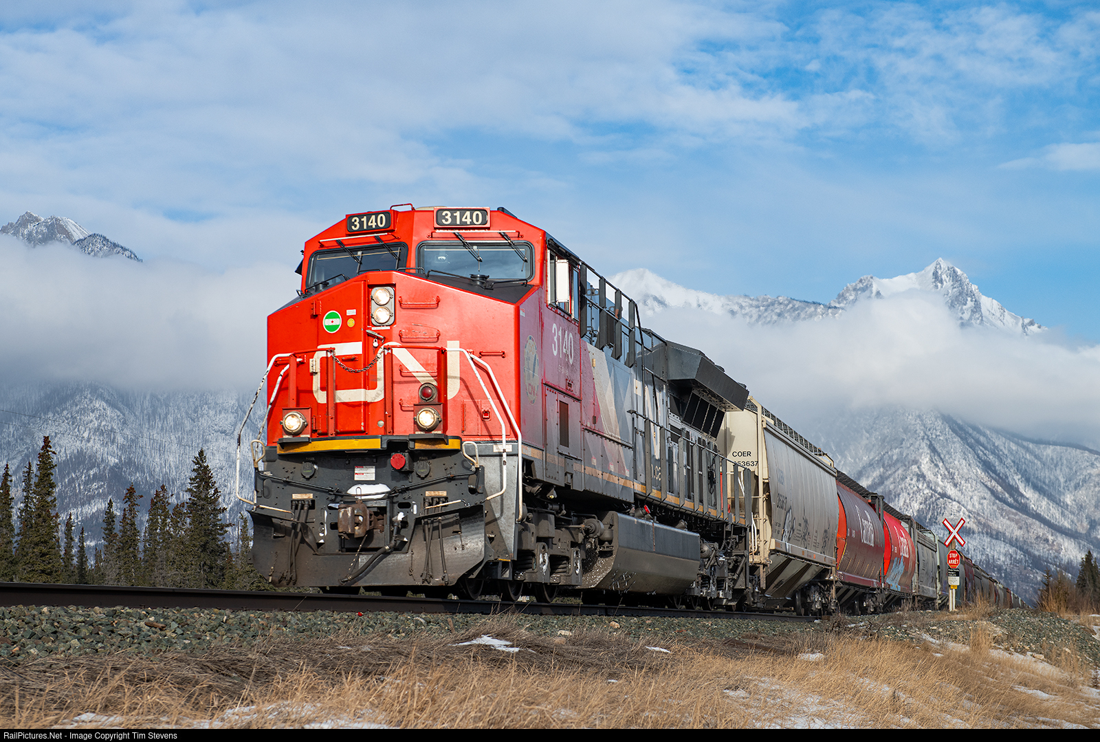 | Grain loads from the Viterra elevator at Vegreville, AB head west on the Edson Sub at Henry House destined to a ship at Prince Rupert, BC. |