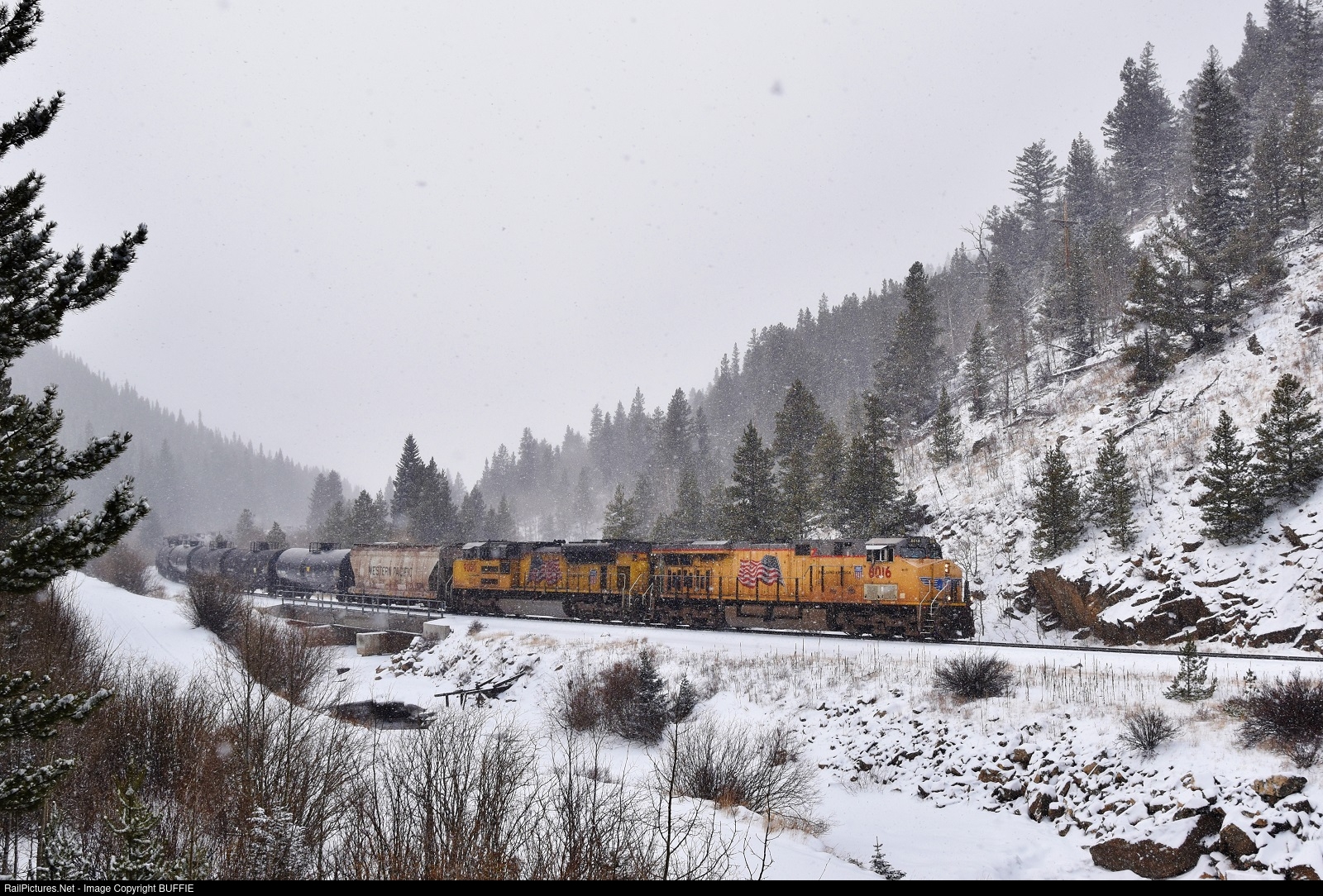 UP 8016 (ES44AC) runs between Tolland and Rollinsville after coming through the Moffat Tunnel and into heavy snow.