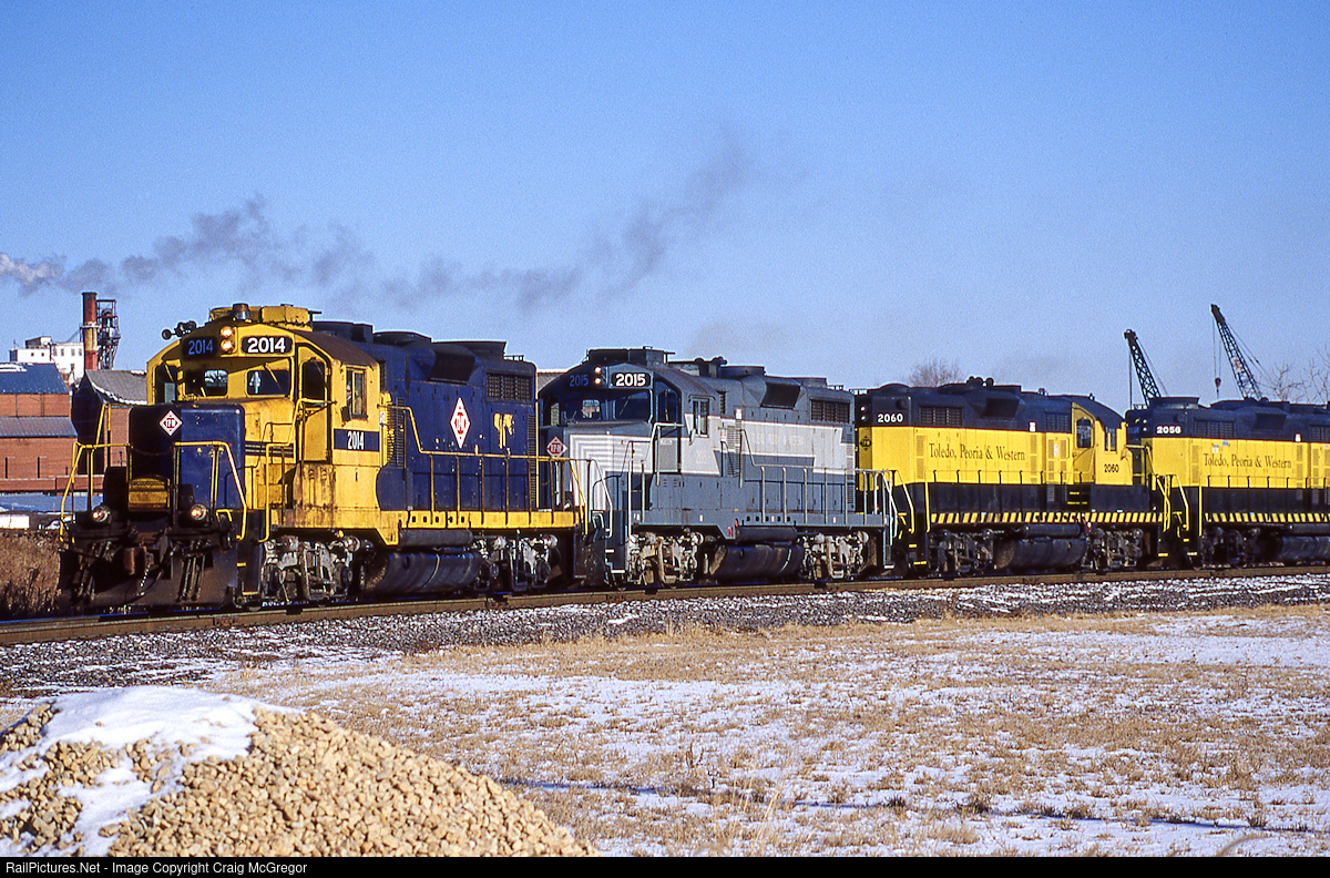 In 1989, the AT&SF sold its former TP&W line to a new TP&W corporation, including 19 GP20 locomotives in the deal. A TP&W train in the 1990's typically included a consist of well-worn GP20s, some still in old ATSF schemes and some repainted. This photo, taken recently after RailAmerica purchase of the line, shows a locomotive in the first post ATSF scheme (NYC inspired lightning stripes) and the NYSW "yellow jacket" scheme reflecting the days of Delaware Otsego control of the line (1996-1999).