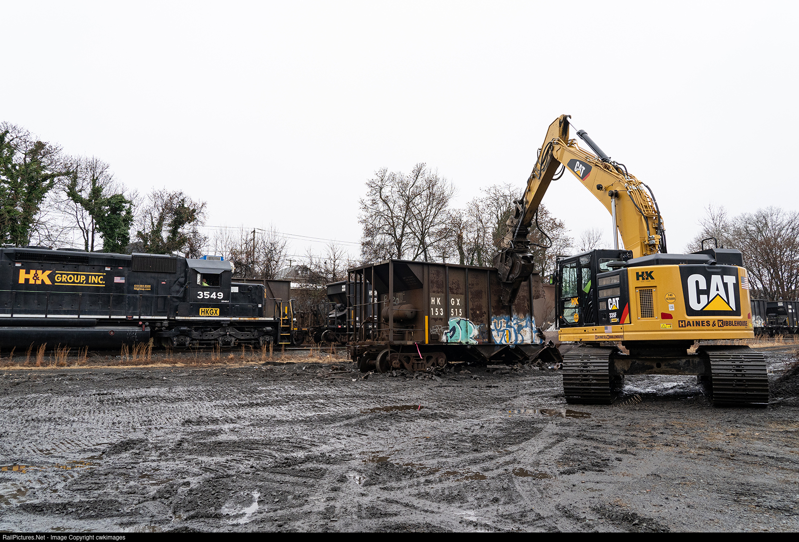 HKGX SD40-2 #3549 passes behind a hopper being cut up for scrap. H&K continually maintains and updates their fleet of rolling stock. In the foreground, a Caterpillar 335F cuts up a hopper that was beyond its useable life. This is one of a few hoppers being cut up fro scrap recycling. |