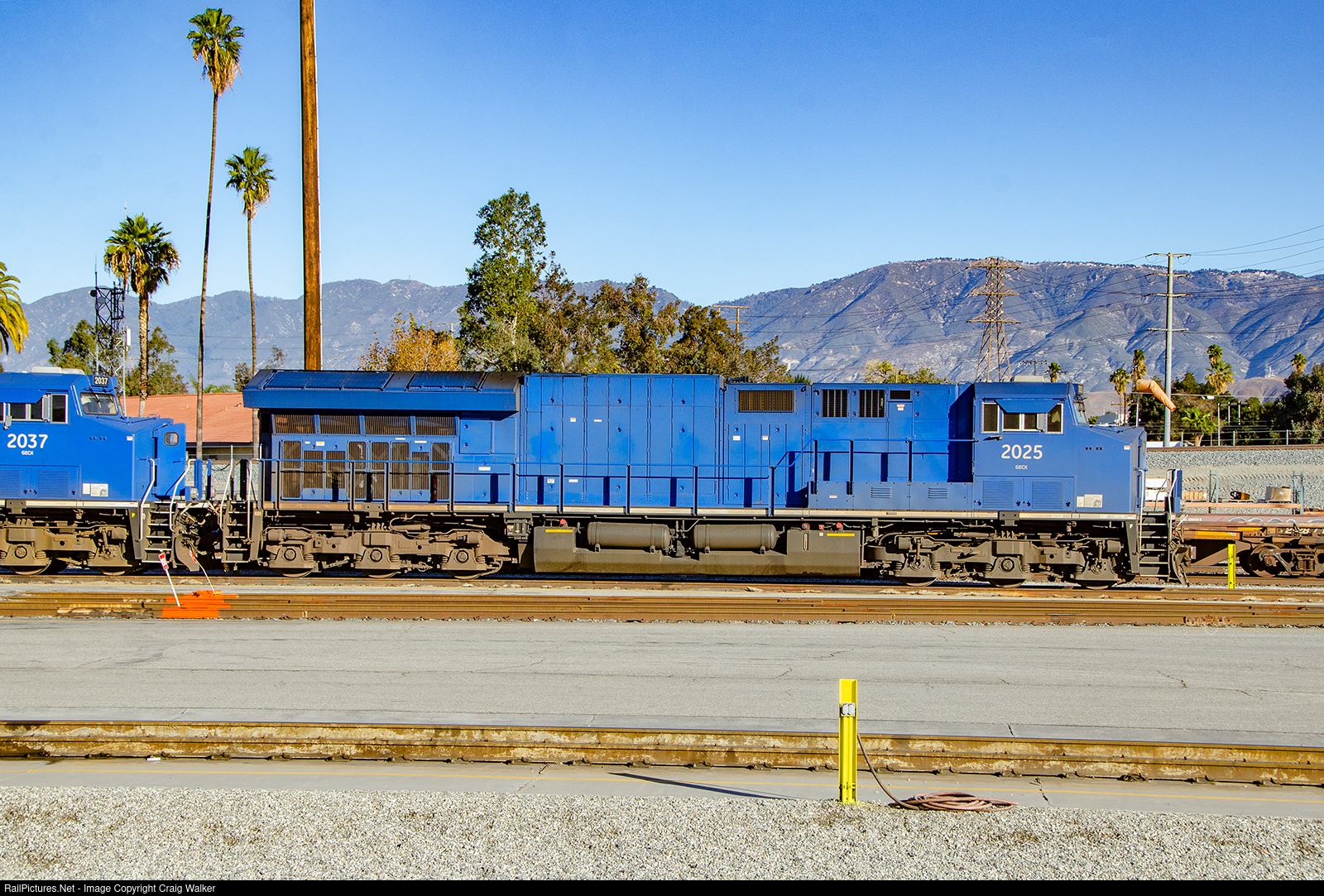A pair of General Electric demonstrators, GECX 2025 and 2037, sit in the small engine facility in BNSF Railway's San Bernardino A Yard. These test locomotives were either ES44AC, ES44A6, ES44C6 or, perhaps, even EF44AC models. Back in 2013, when these were built, even GE was unsure what to call these! And not far behind these, in another set of power, was GECX 2024, which was testing on the Union Pacific the previous year. (San Bernardino, California – December 12, 2015)