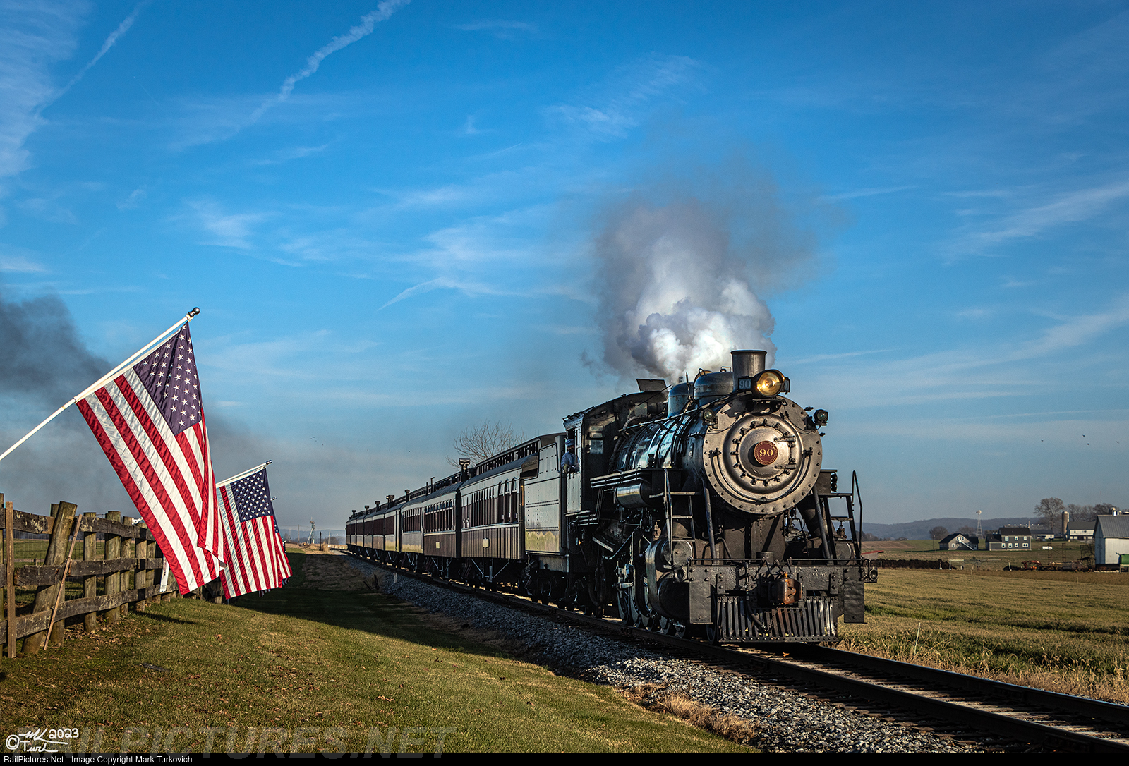 Strasburg Rail Road 90 hustles by the American Flags at Fairview on a sunny December afternoon.
