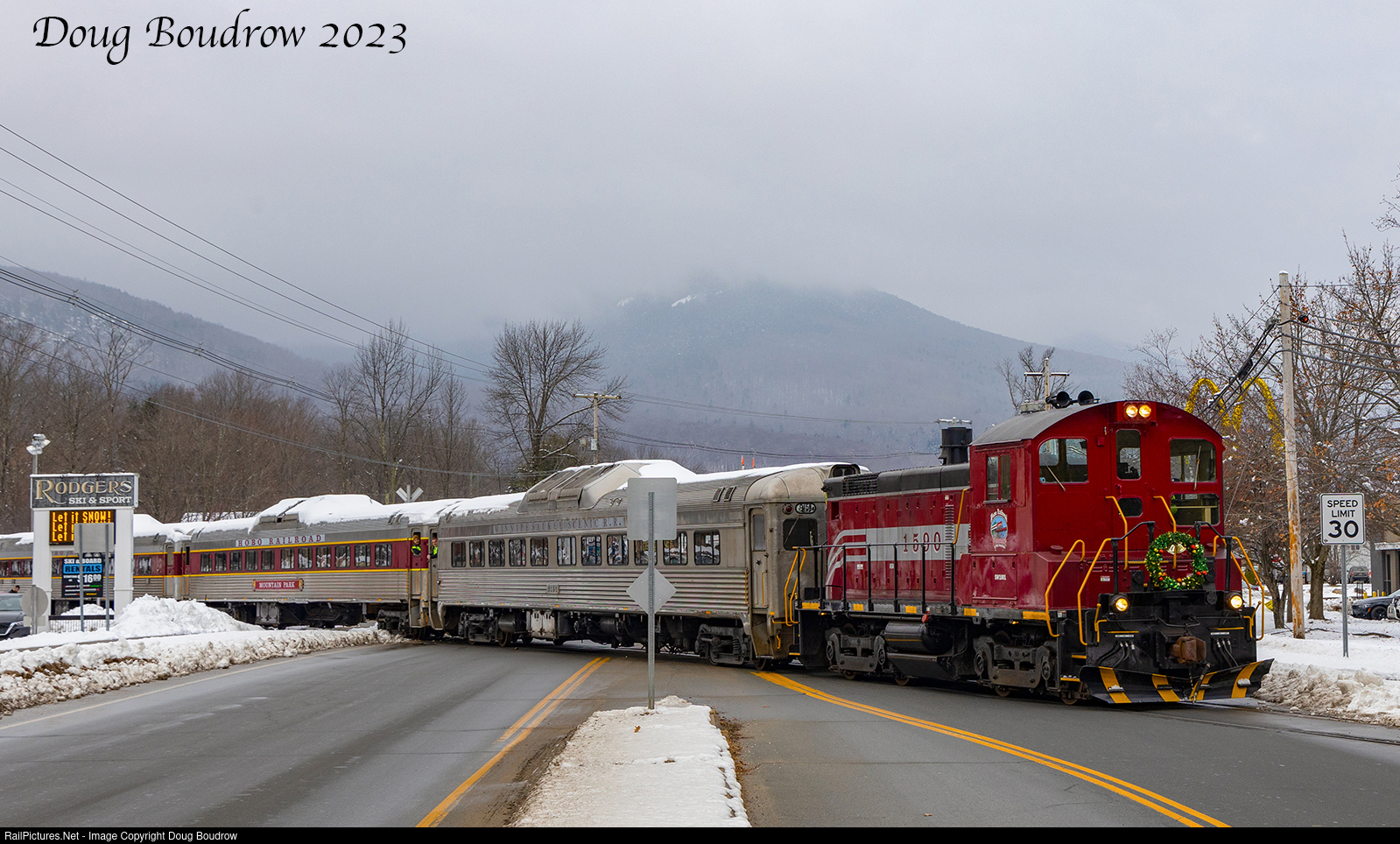 | Just after 1 pm, the Hobo Railroad Santa train is seen departing Lincoln crossing the Kancamagus Highway. The Hobo Railroad and parent company Plymouth & Lincoln operate scenic and excursion trains over former Boston & Maine rails in the White Mountains and Lakes Regions of New Hampshire. |