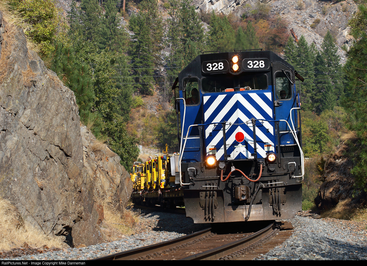| Montana Rail Link EMD SD45 No. 328 powers a westbound MRL work train through a cut between Eddy and Thompson Falls, Montana, on September 21, 2012. |