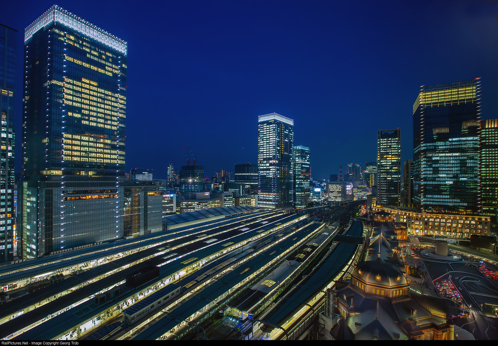 View onto Tokyo Station in the Japanese capital Tokyo. It is located on the border between the central districts of Chiyoda and Chuo and between the districts of Marunouchi in the west and Yaesu in the east. The Imperial Palace, numerous skyscrapers and the Ginza district are located nearby. As Tokyo's nominal main station, it is one of the most important railroad stations in the country, although Shinjuku and Ikebukuro stations have more travelers. Tokyo is the most important hub of the Shinkansen network and the starting point of two high-speed lines. While JR Central operates the Tokaido Shinkansen to Nagoya and Osaka, JR East is responsible for operating the Tuhoku Shinkansen and all routes branching off from it. JR East also operates several city and regional lines through Tokyo Station. The station complex comprises ten standard-gauge tracks for high-speed trains and 18 cap-gauge tracks for conventional rail traffic (eight of which are located in two tunnel stations). There is also a double-track subway station and a bus station for long-distance bus services. Tokyo station has a station building on both sides of the facility. On the west side is the Marunouchi Building, designed by Tatsuno Kingo and opened in 1914, which is one of the city's most important sights. The architecture of the red brick building is based on the European Neo-Renaissance style of the late 19th century.