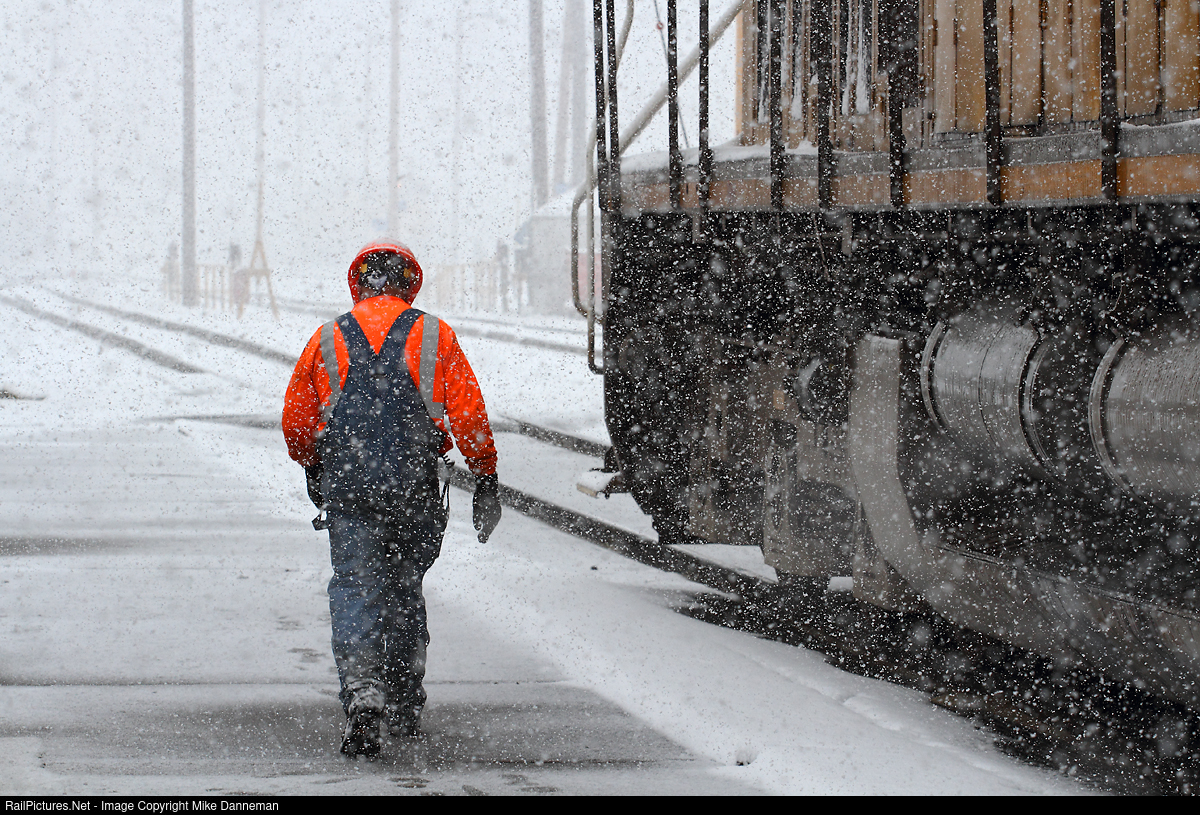 A Union Pacific fuel track employee trundles out into the heavily falling snow to his next assignment at UP’s North Yard locomotive facility on April 15, 2013.